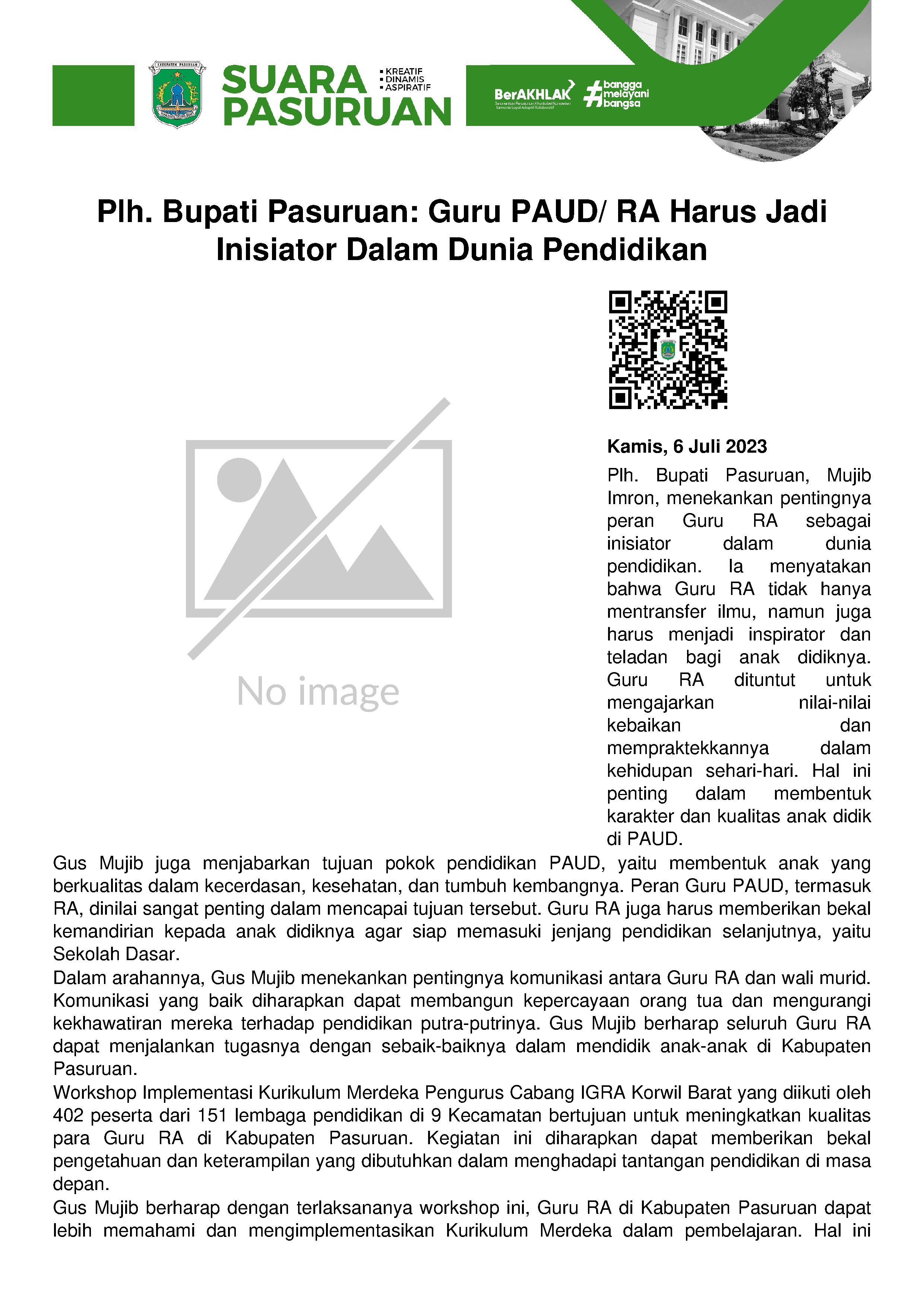 Guru Raudatul Atfal (RA) sebagai salah satu bentuk satuan Pendidikan Anak Usia Dini (PAUD) jalur formal melalui program pendidikan umum dan keagamaan Islam bagi anak harus menjadi inisiator dalam dunia pendidikan. Penegasan itu disampaikan oleh Plh. Bupati Pasuruan, Mujib Imron pada saat membuka Workshop Implementasi Kurikulum Merdeka Pengurus Cabang IGRA Korwil Barat.