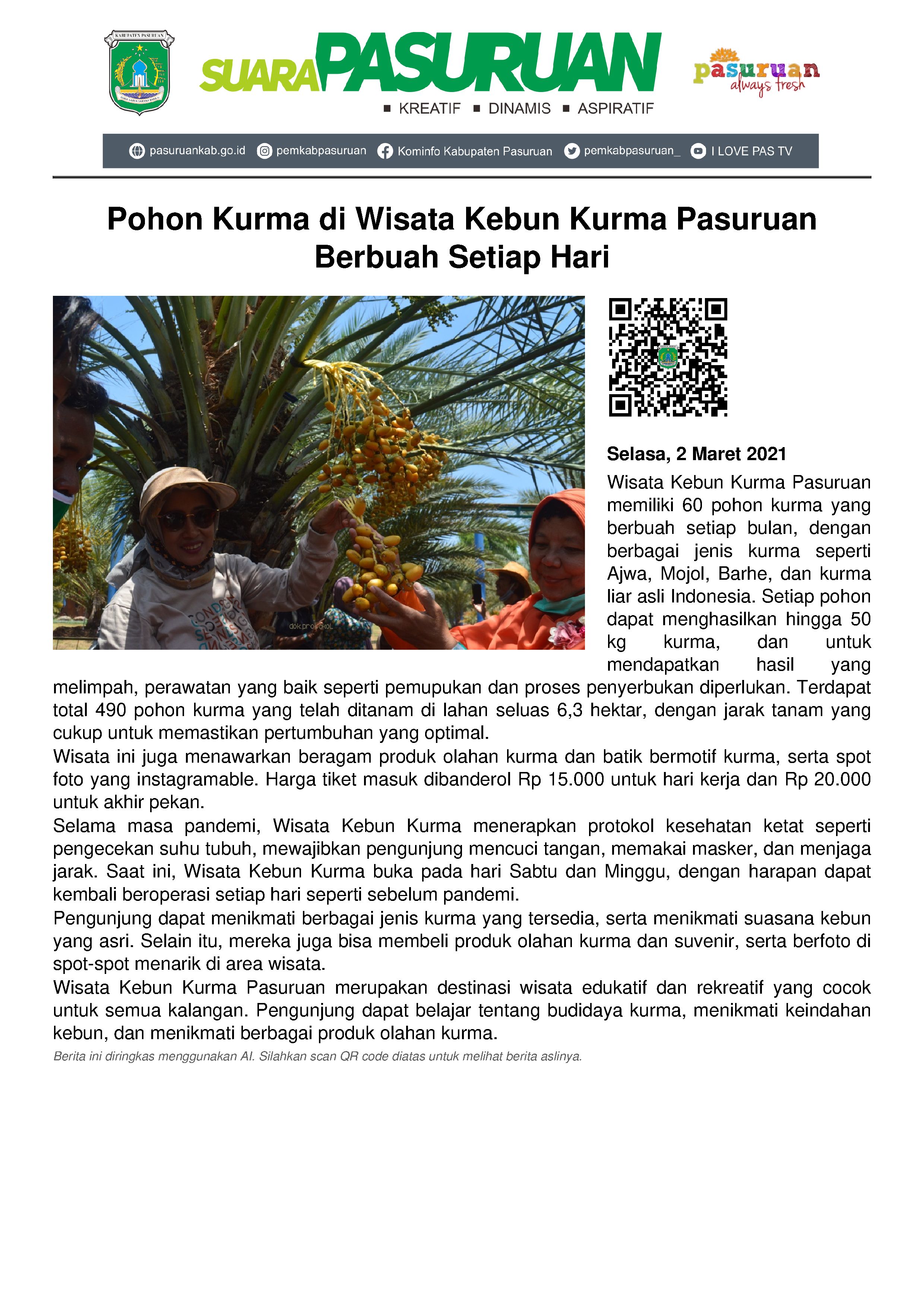 Sementara itu, selama masa pandemi, Wisata Kebun Kurma menerapkan protokol kesehatan yang ketat seperti pengecekan suhu tubuh, mewajibkan pengunjung mencuci tangan, memakai masker dan menjaga jarak dengan pengunjung lainnya.