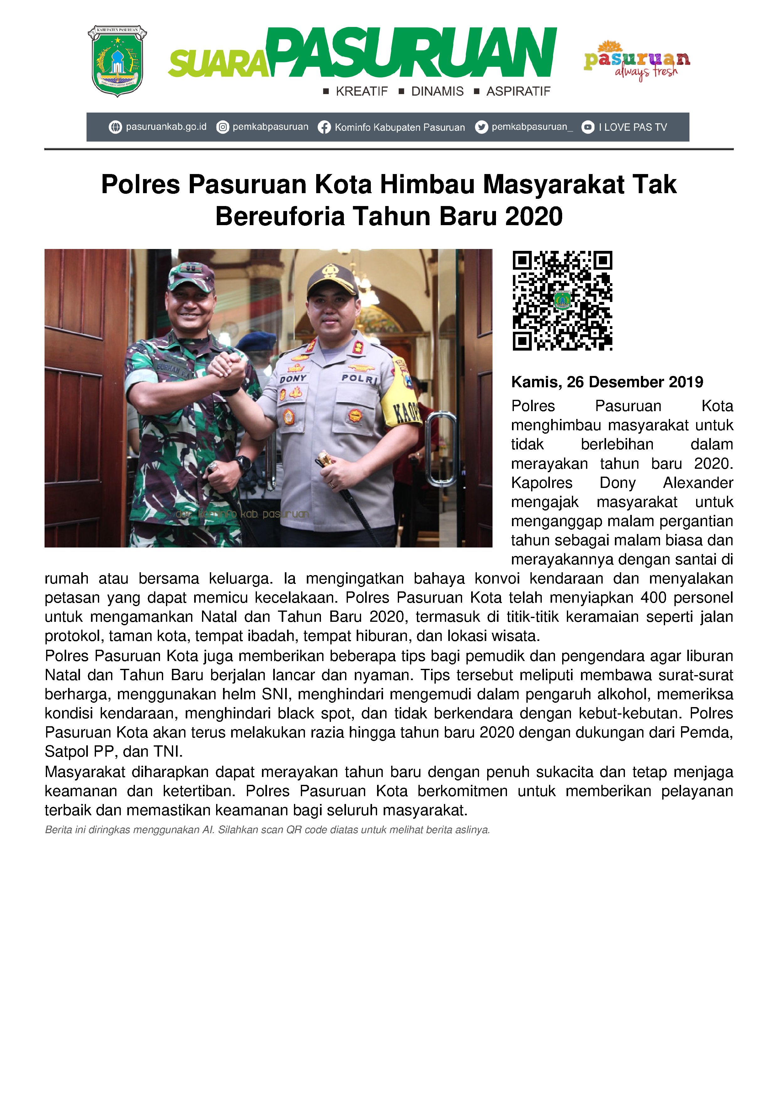 Menjelang pergantian tahun baru 2019 ke 2020, Kapolres Pasuruan Kota, AKBP Dony Alexander menghimbau seluruh lapisan masyarakat agar tidak berlebihan dalam merayakannya.