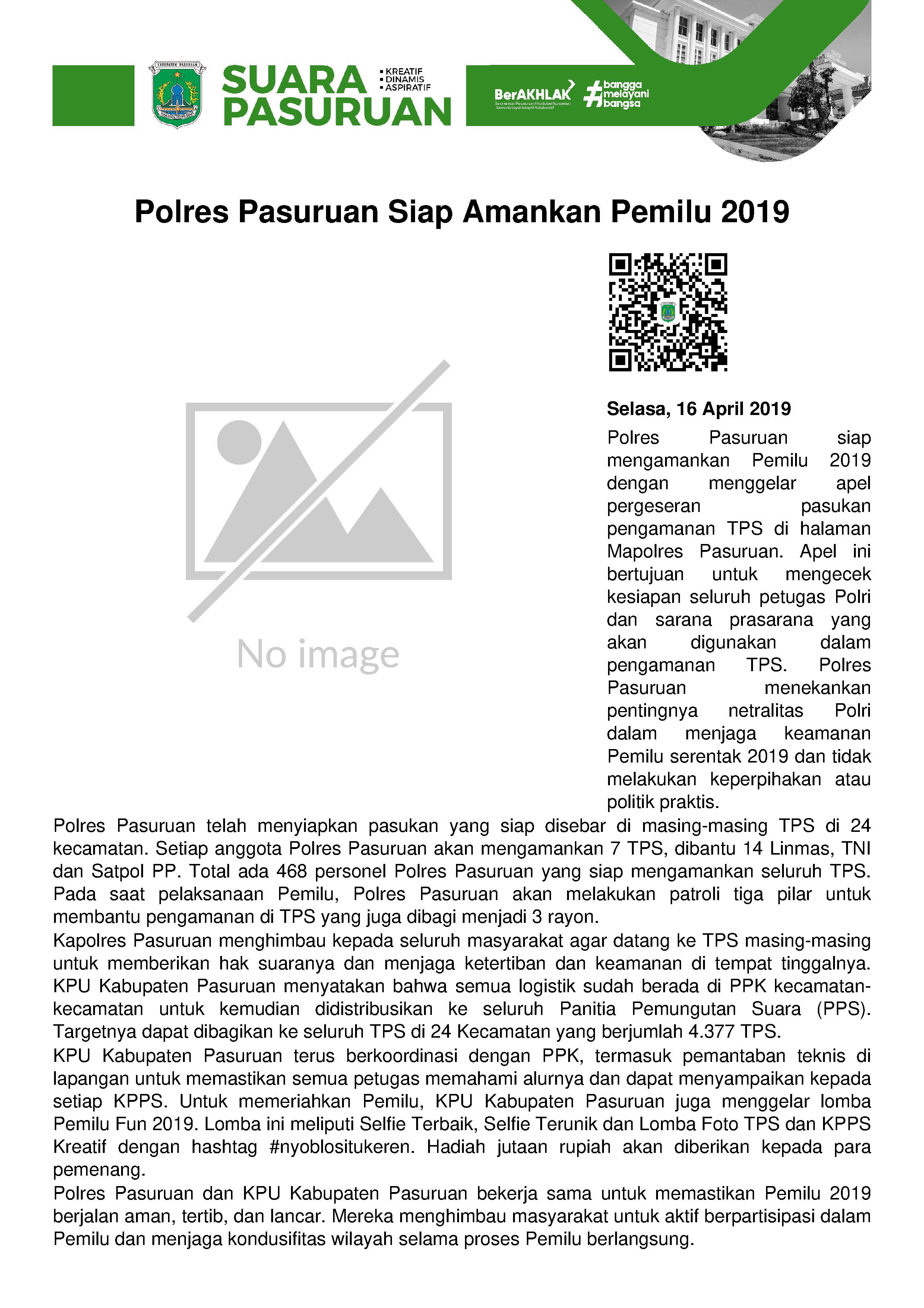 H-1 menjelang pelaksanaan Pemilihan Legislatif dan Pemilihan Presiden 2019, Polres Pasuruan siap mengamankan dan memberikan kenyamanan kepada masyarakat di wilayah Kabupaten Pasuruan. Baik pengamanan yang dilakukan di lokasi Tempat Pemungutan Suara (TPS) maupun menjaga kondisi keamanan dan ketertiban masyarakat (kamtibmas) selama Pemilu berlangsung.