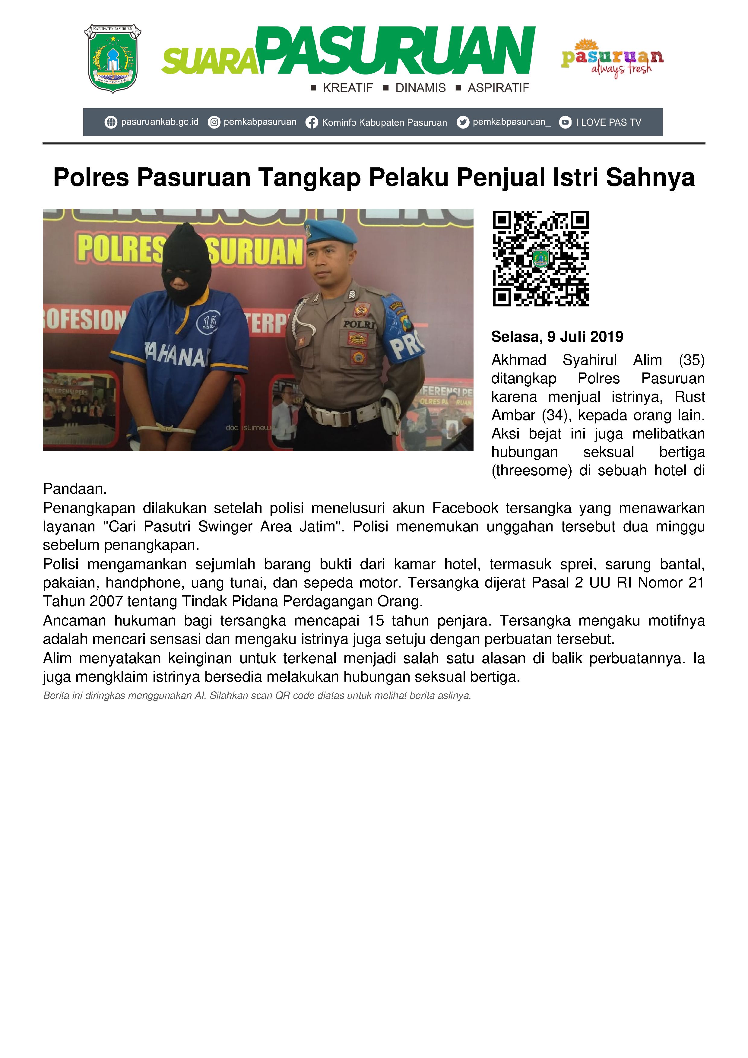 Parahnya lagi, tak hanya menjualnya. Pelaku yang kini sudah ditetapkan sebagai tersangka oleh Polres Pasuruan itu mengajak istrinya untuk berhubungan badan bersama-sama alias threesome. Jelas itu adalah perbuatan melawan hukum.