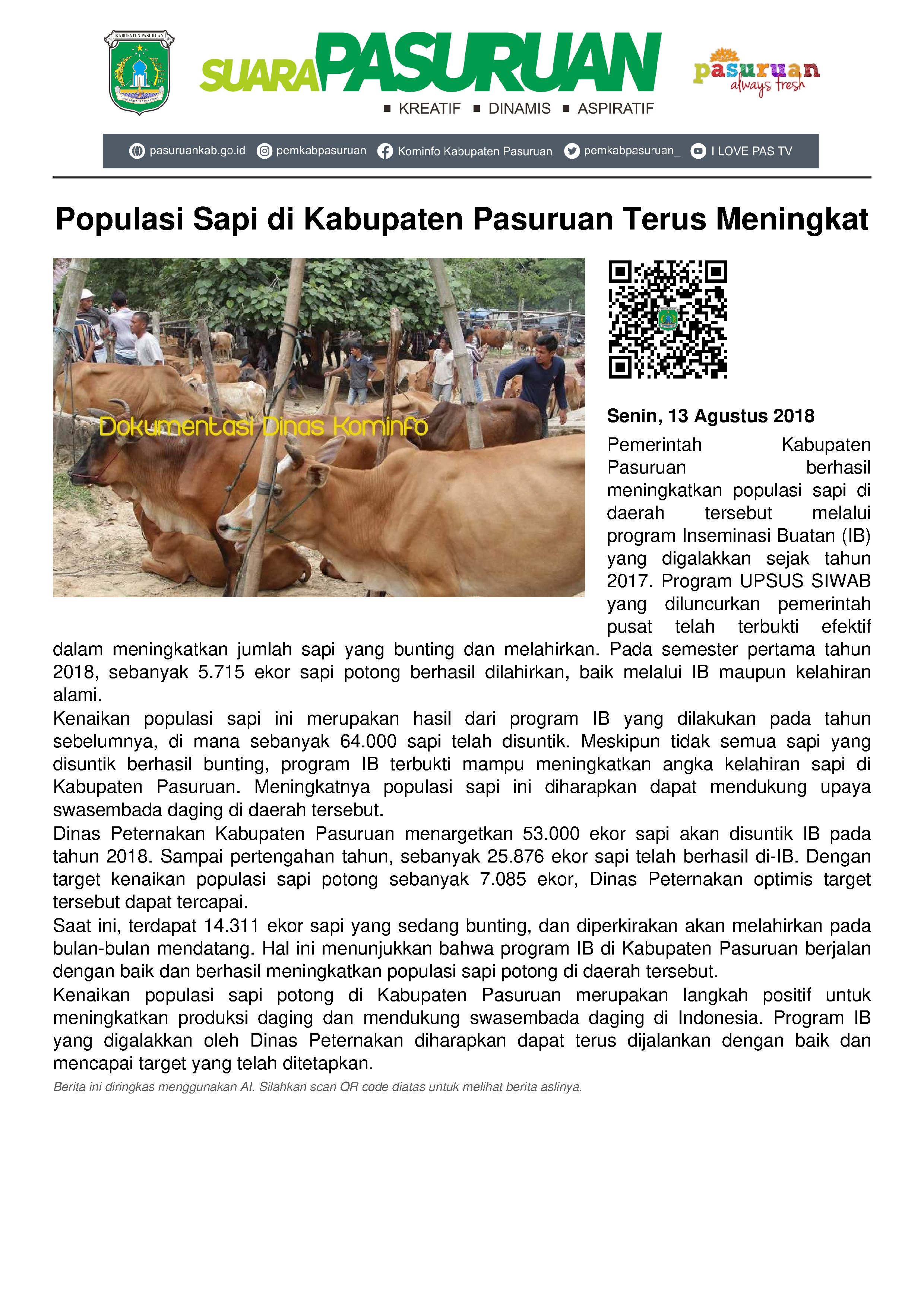 Semenjak Pemerintah Pusat menggalakkan program Upaya Khusus sapi indukan wajib bunting (UPSUS SIWAB) pada tahun lalu, Pemkab Pasuruan melalui Dinas Peternakan sukses memperbanyak jumlah populasi sapi pada tahun ini.