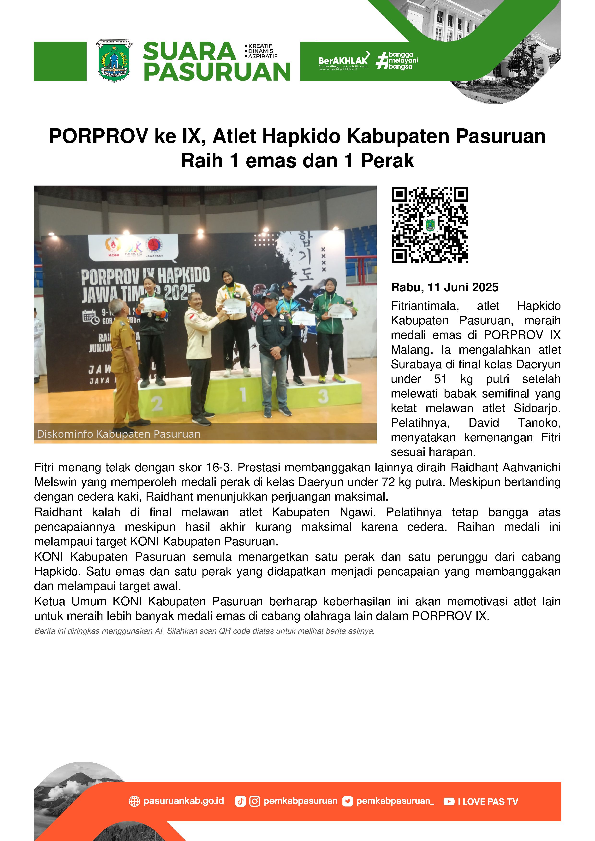 Dalam dua hari berturut-turut, remaja 19 tahun dari Kecamatan Purwosari itu berhasil mengalahkan atlet dari Kota Surabaya dalam babak final yang digelar di GOR Kanjuruhan Malang, Selasa (11/6/2025) kemarin.