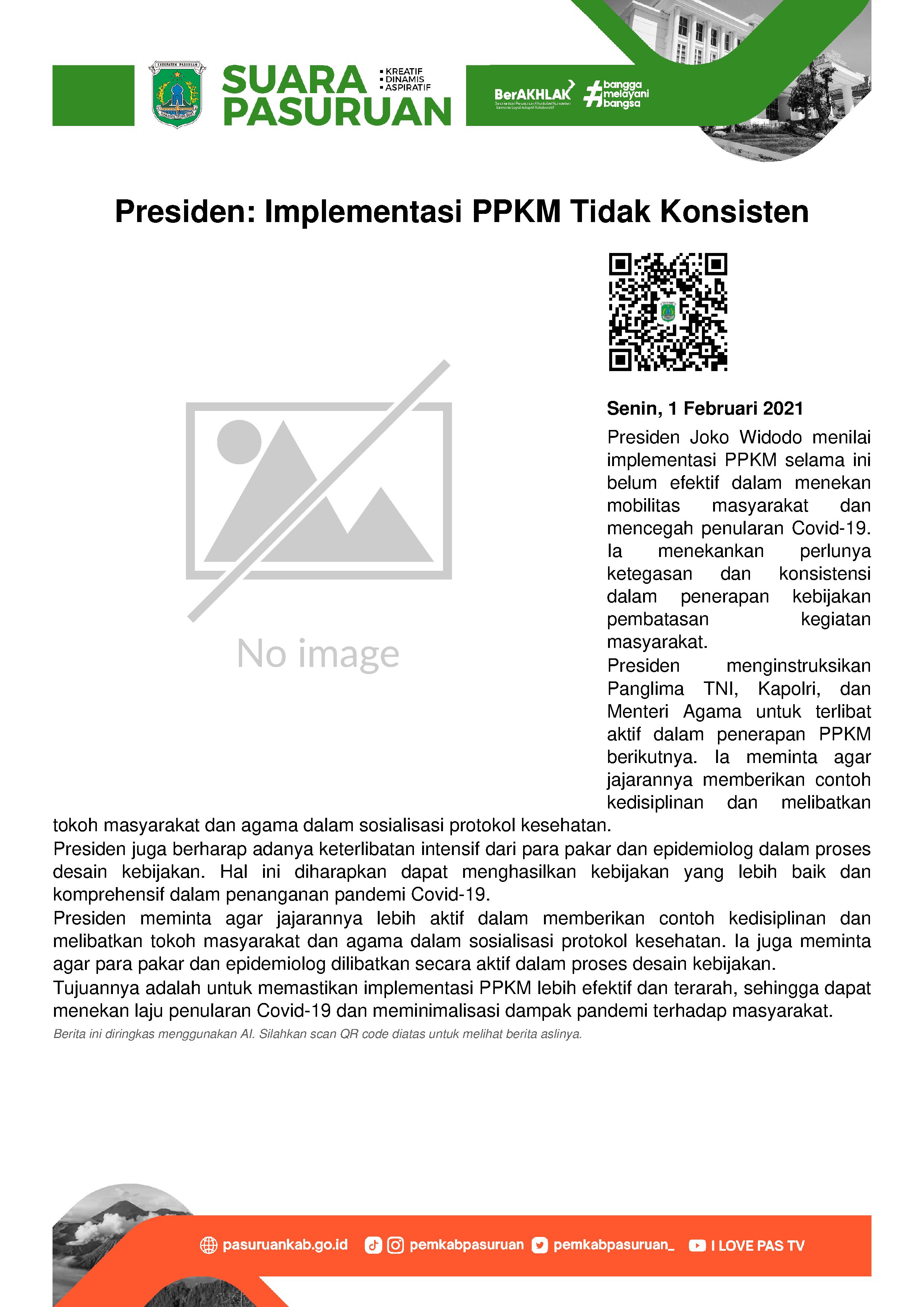 Dari hasil pantauan dan evaluasi selama masa perpanjangan Pemberlakuan Pembatasan Kegiatan Masyarakat (PPKM), Presiden RI Joko Widodo menilai jika dalam pelaksanaannya masih belum efektif. Padahal, esensi dari kebijakan pembatasan kegiatan masyarakat yang diberlakukan di tengah pandemi saat ini adalah mengurangi. Bahkan mencegah terjadinya mobilitas masyarakat untuk menekan laju penularan Covid-19.