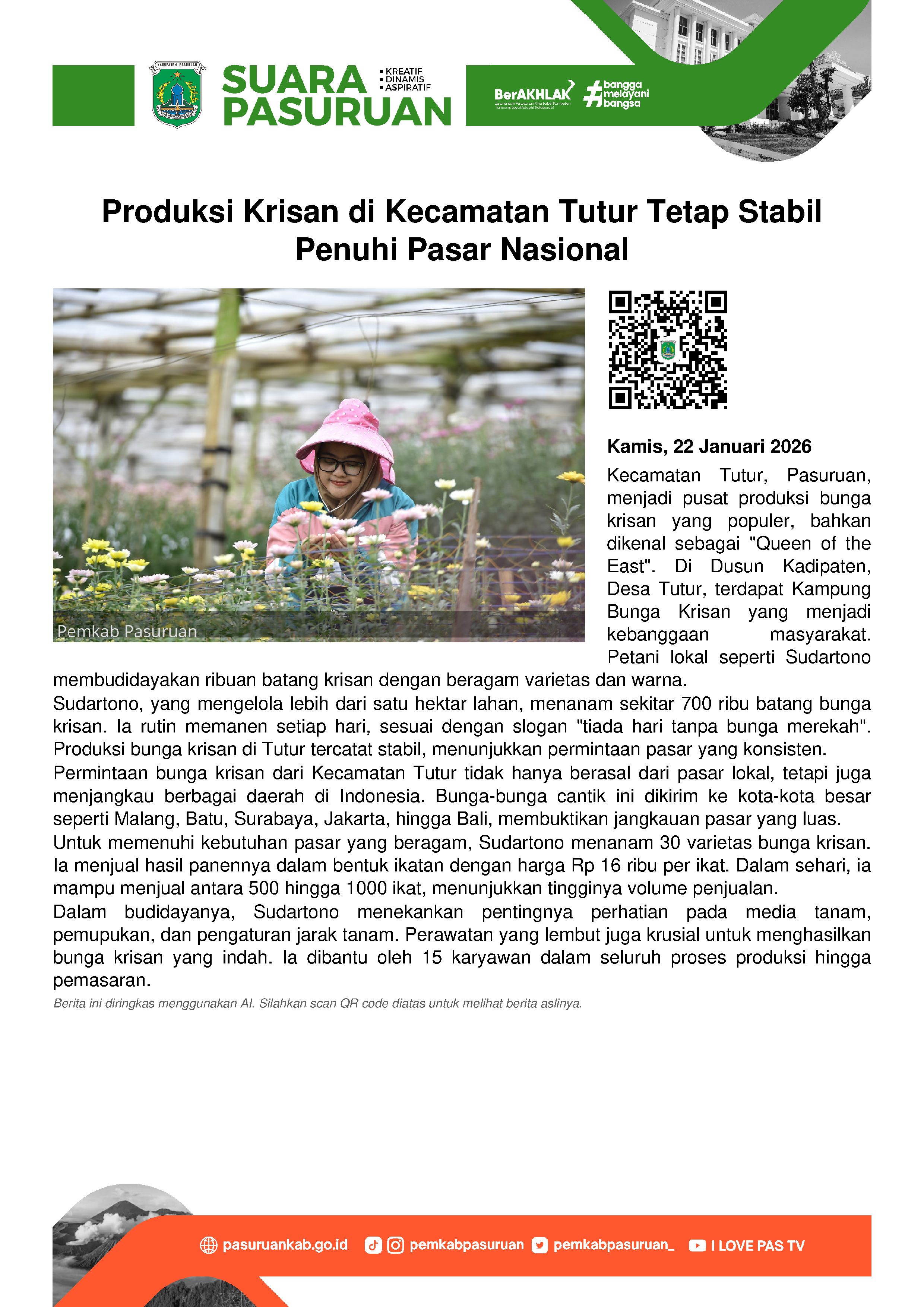 Dia adalah bunga krisan. Bunga ini menjadi kebanggaan masyarakat di Kecamatan Tutur, Kabupaten Pasuruan. Saking cintanya sampai-sampai ada Kampung Bunga Krisan di Dusun Kadipaten, Desa Tutur.