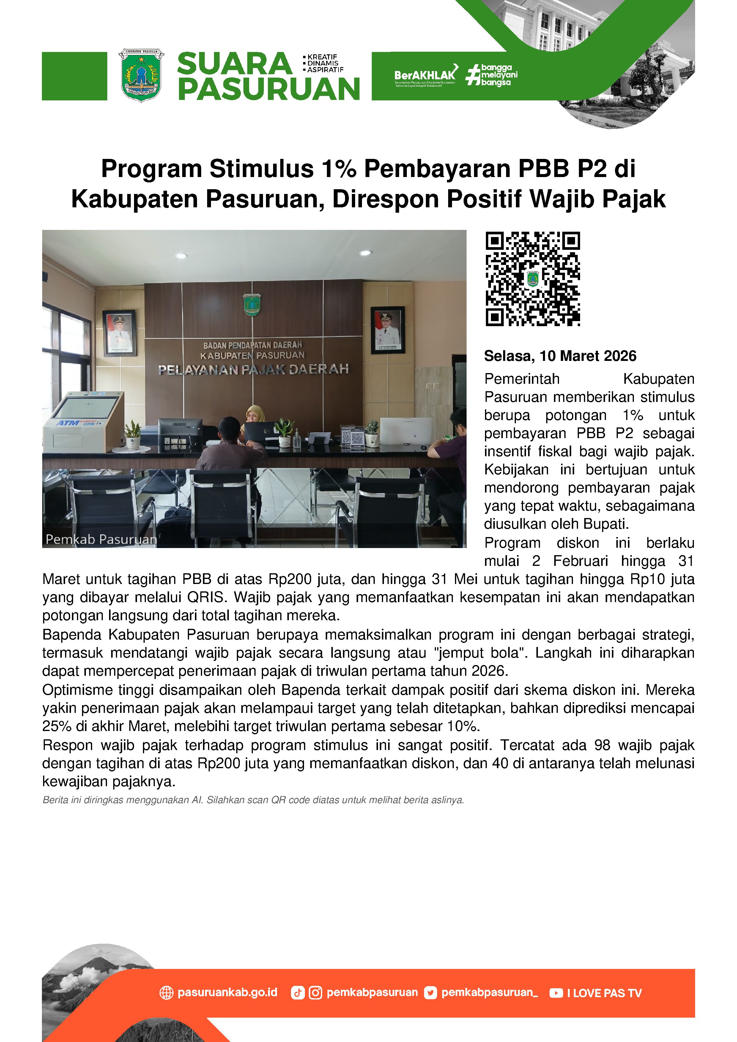 Pemkab Pasuruan memberikan insentif fiskal atau stimulus potongan 1% kepada wajib pajak PBB P2 (Pajak Bumi dan Bangunan Pedesaan Perkotaan).