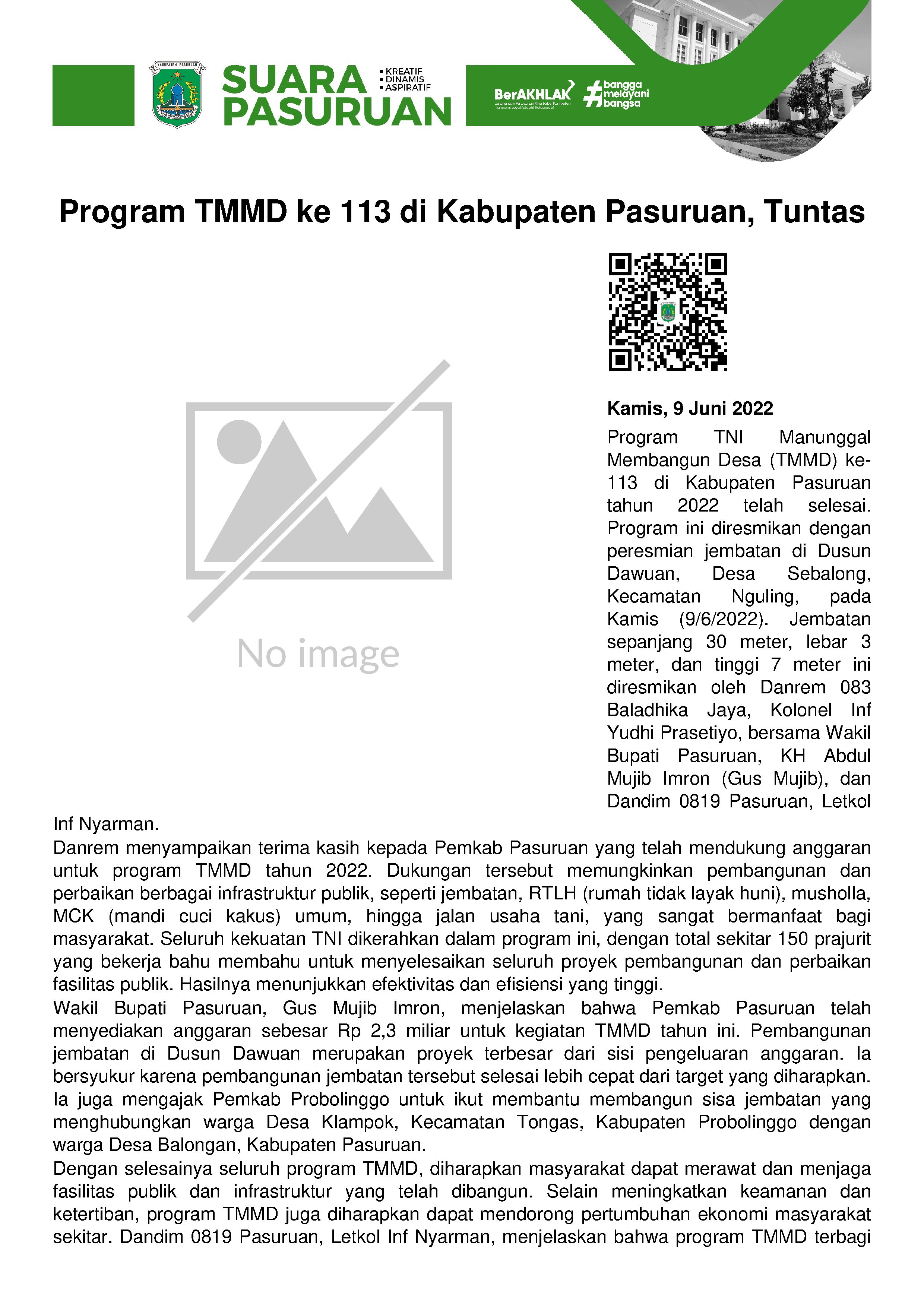 Program TNI Manunggal Membangun Desa (TMMD) ke 113 di Kabupaten Pasuruan tahun 2022, akhirnya tuntas.