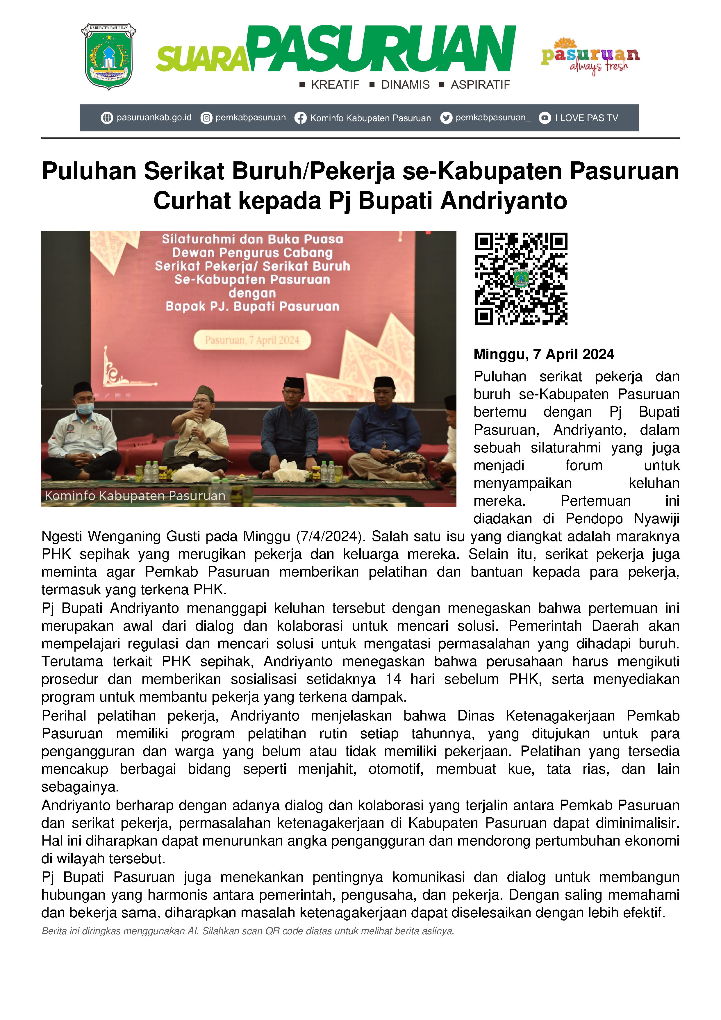 Momentum Bulan Suci Ramadhan 1445 Hijriyah jadi ajang silaturahmi para Serikat Pekerja/Buruh se-Kabupaten Pasuruan sekaligus curhat kepada Pj Bupati Pasuruan, Andriyanto Minggu (7/4/2024) sore.