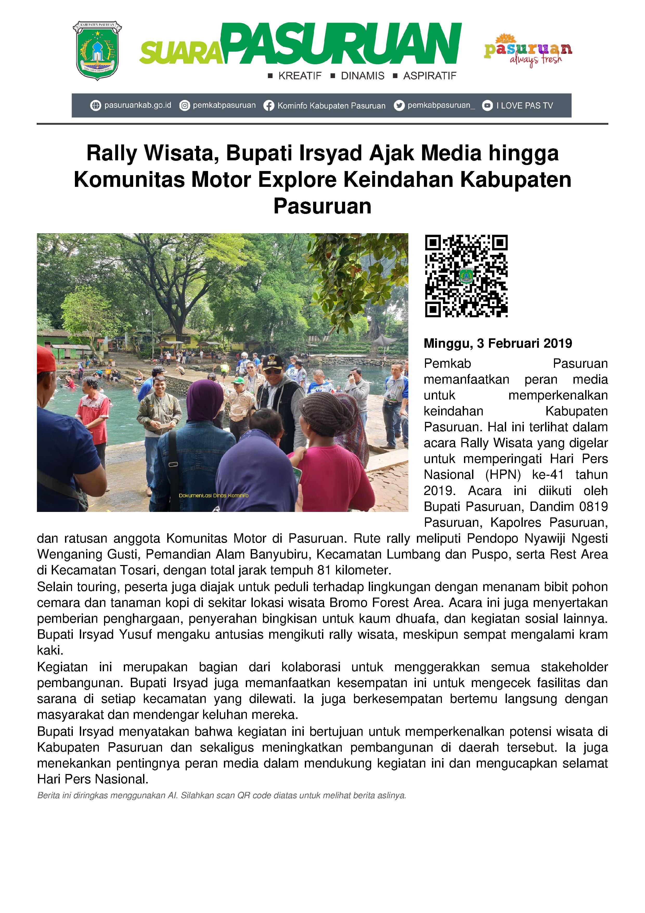 “Banyak manfaat yang saya ambil ketika ikut rally ini. Bisa turun langsung melihat kondisi kerusakan jalan pasca proyek umbulan dan intensitas hujan yang cukup tinggi akhir-akhir ini. Dan yang terpenting adalah bisa bertemu masyarakat secara langsung dan menjawab keluhan-keluhan selama ini. Insya Allah khusus Banyubiru akan segera kita pugar dan sempurnakan sebagai wisata pemandian syari’ah. Terima kasih untuk rekan-rekan media yang selama ini banyak membantu pemberitaan di Kabupaten Pasuruan. Selamat Hari Pers Nasional,” ucapnya. (emil)