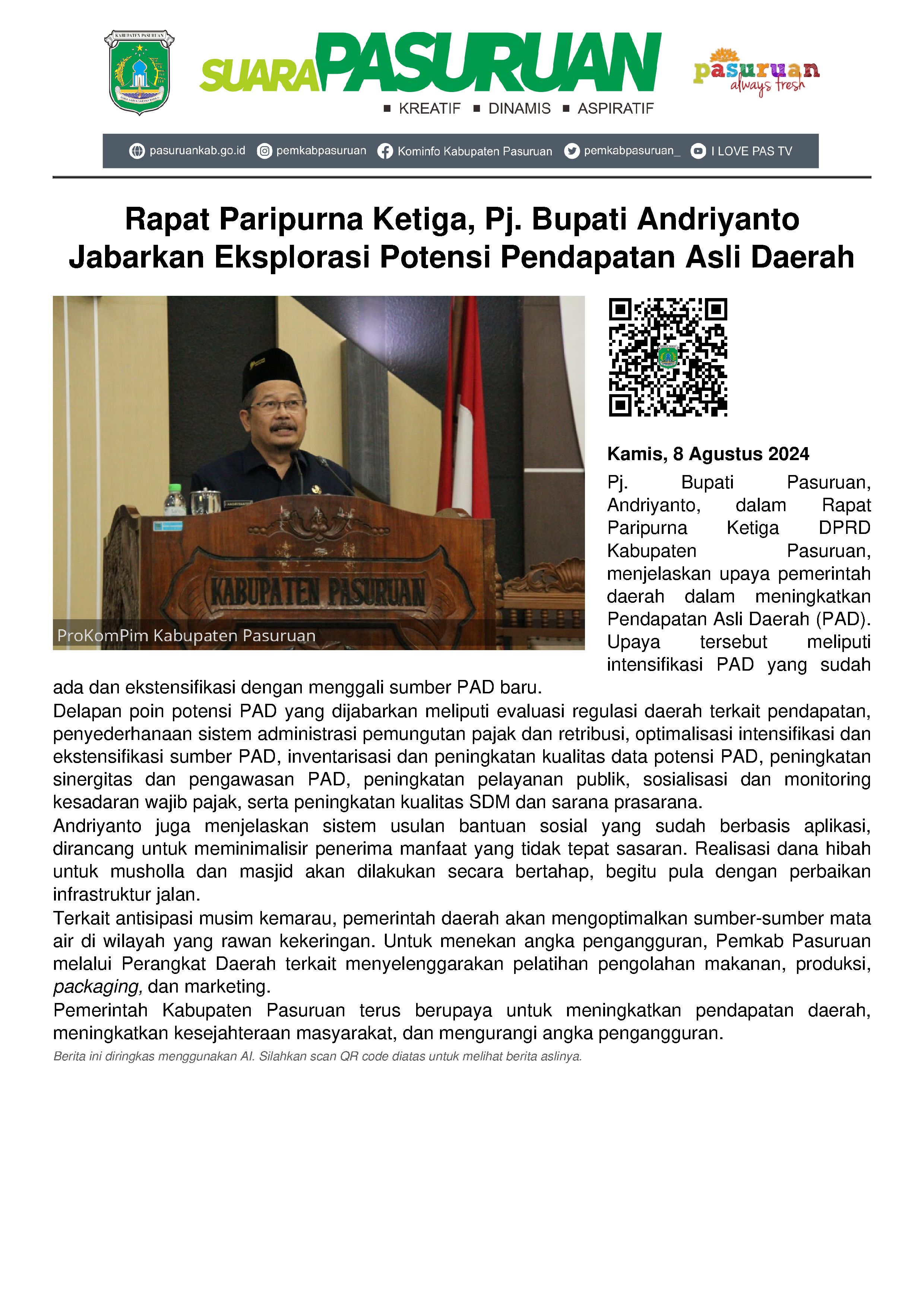 Hadir dalam Rapat Paripurna Ketiga DPRD Kabupaten Pasuruan, Penjabat (Pj.) Bupati Pasuruan, Andriyanto menjabarkan upaya Pemerintah Daerah dalam mengoptimalkan sumber-sumber pendapatan daerah. Baik yang diperoleh dengan melakukan intensifikasi Pendapatan Asli Daerah (PAD) maupun ekstensifikasi dengan mengupayakan PAD baru.