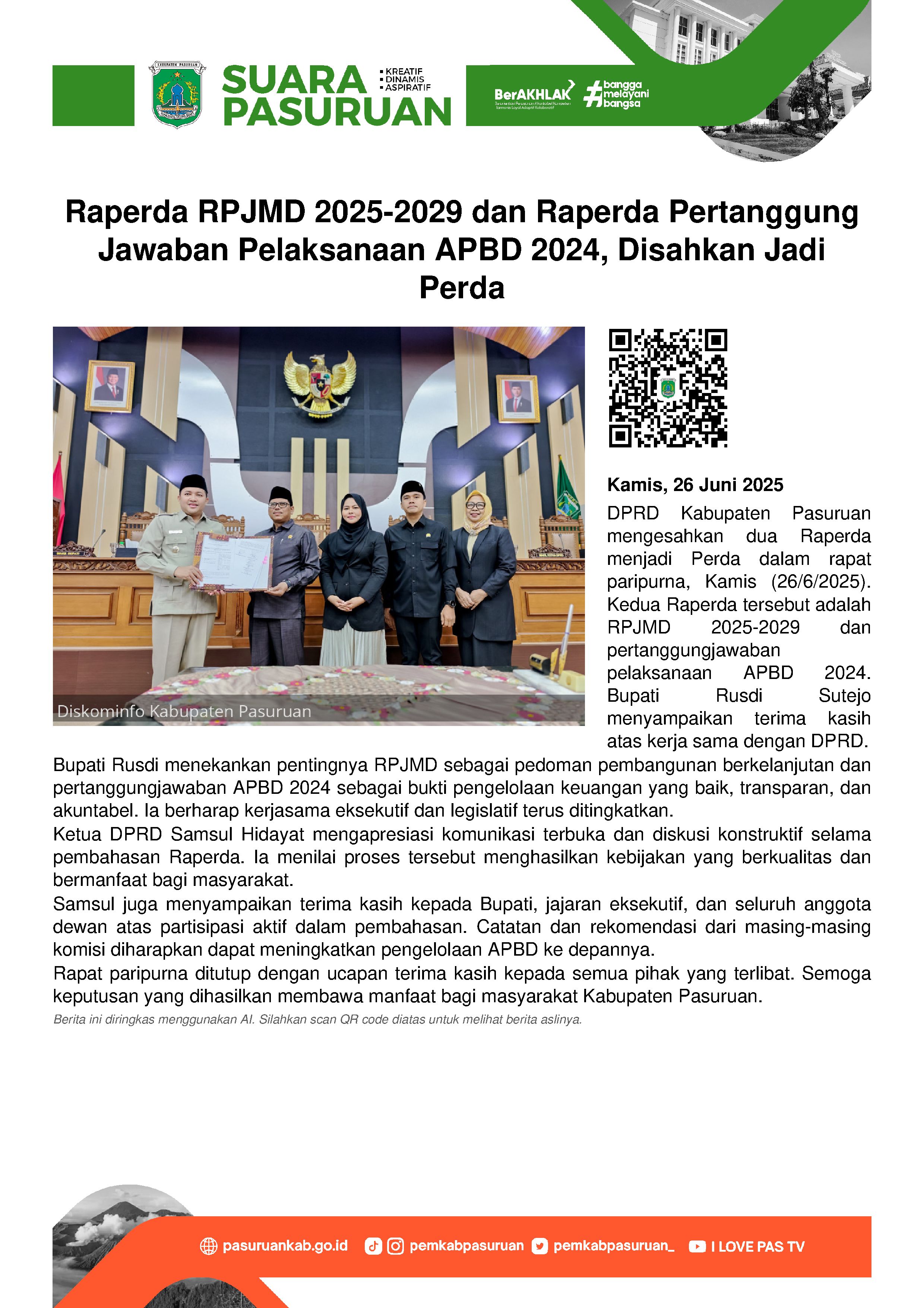Pengesahan dua raperda menjadi Peraturan Daerah (Perda) tersebut dilakukan dalam rapat paripurna DPRD Kabupaten Pasuruan, Kamis (26/6/2025) dan ditandai dengan penandatanganan berita acara oleh Bupati Pasuruan, Rusdi Sutejo dan Pimpinan DPRD Kabupaten Pasuruan.