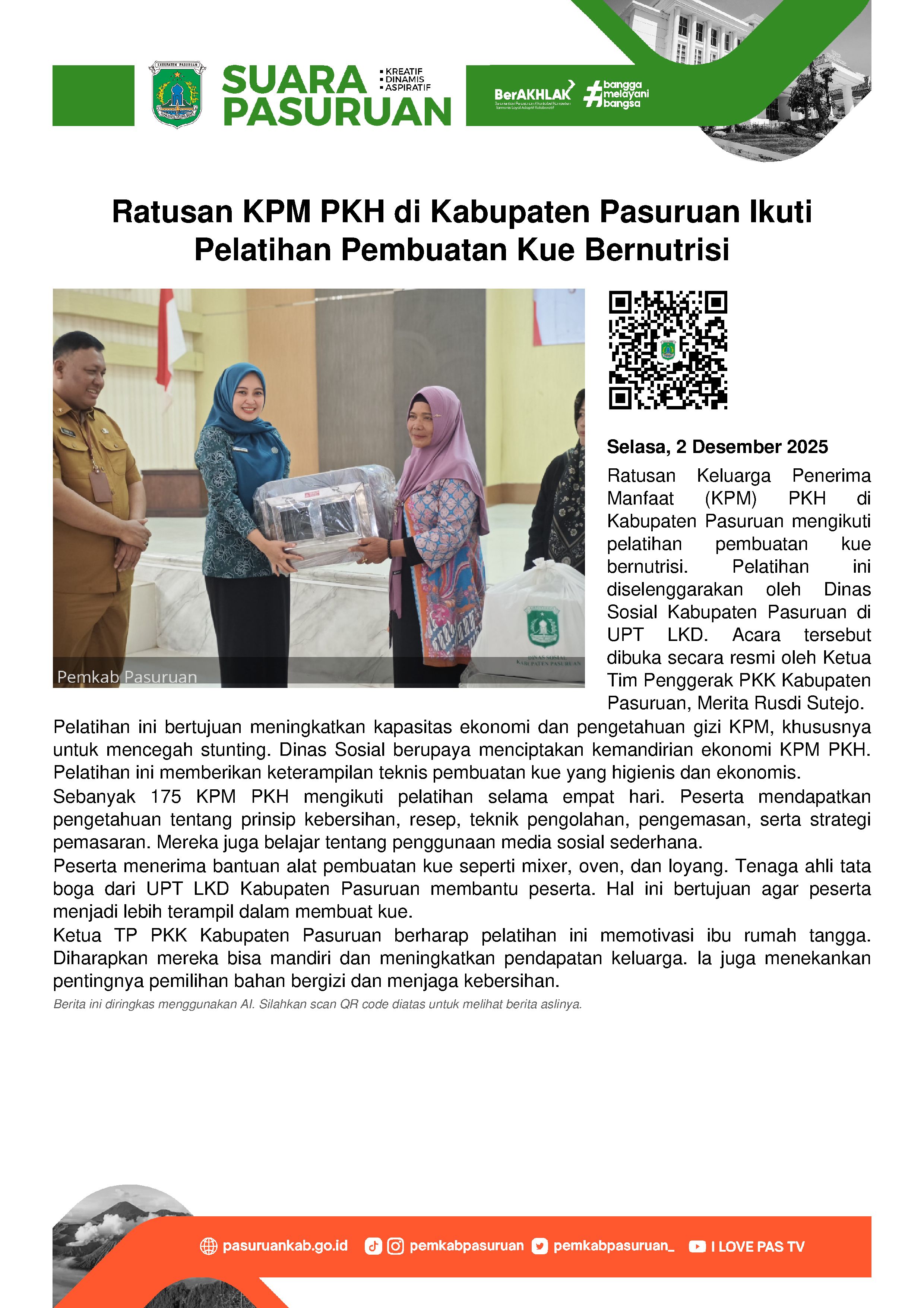 Ratusan keluarga penerima manfaat (KPM) program keluarga harapan (PKH) di Kabupaten Pasuruan mengikuti pelatihan pembuatan kue bernutrisi, Selasa (2/12/2025).