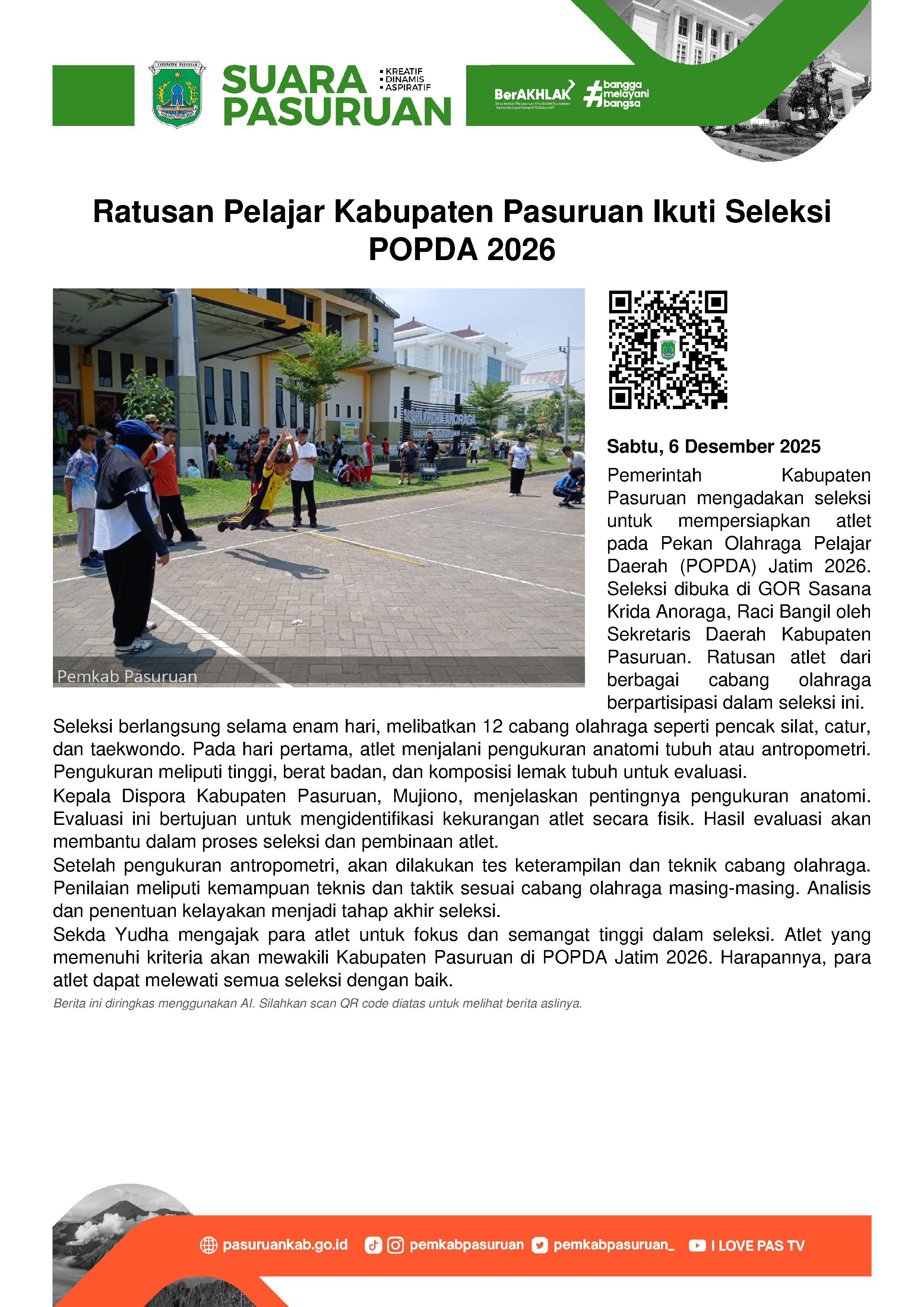 Untuk mempersiapkan para atlet pada Pekan Olahraga Pelajar Daerah (POPDA) Jatim tahun 2026 mendatang, Pemerintah Kabupaten Pasuruan melalui Dinas Pemuda dan Olahraga menggelar Seleksi, Sabtu (6/12/2025).
