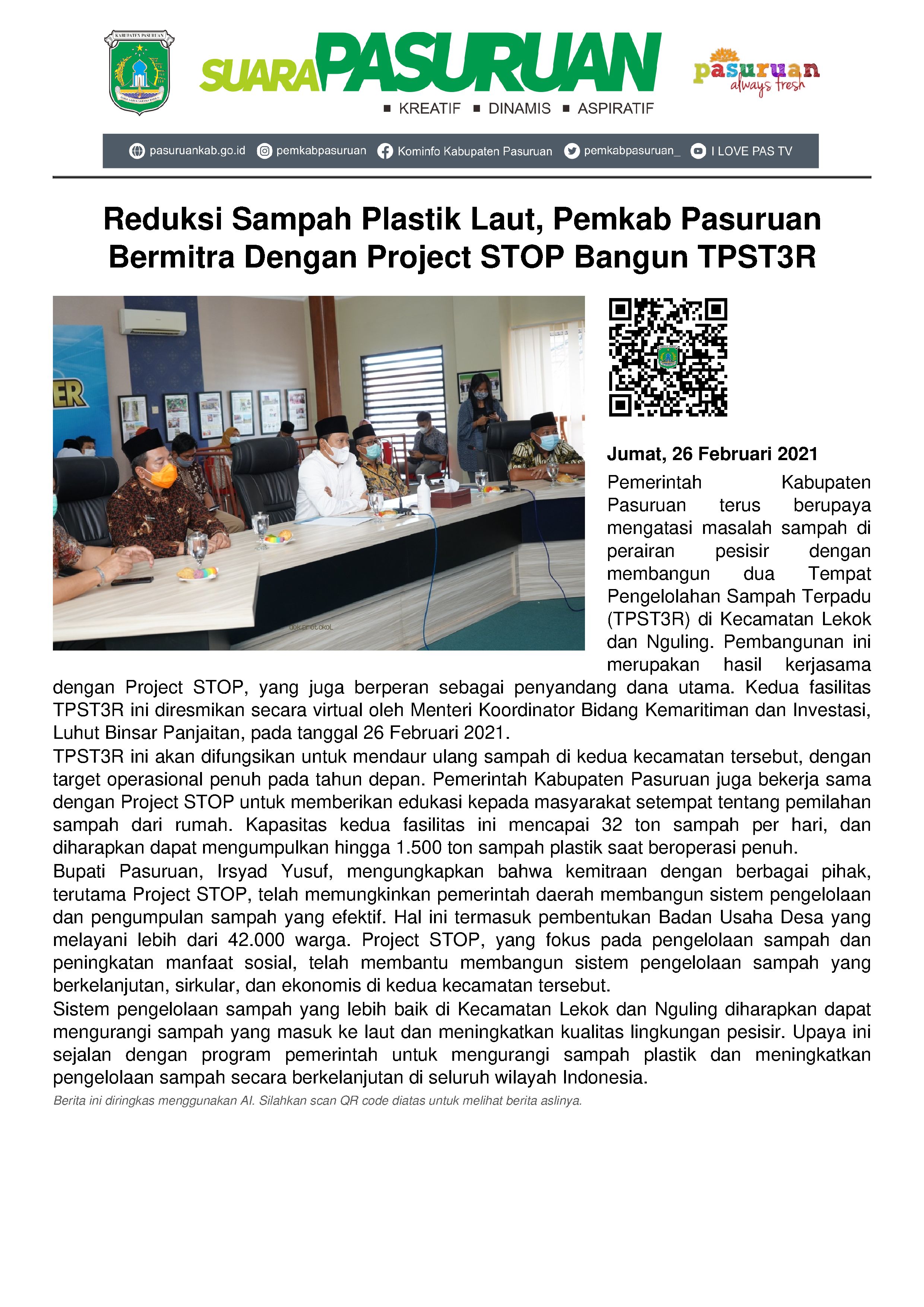 Untuk mengatasi permasalahan sampah di perairan pesisir, Pemerintah Kabupaten Pasuruan semakin memperkuat jejaring kerjasama dengan multi pihak. Diantaranya dengan Project STOP sebagai mitra dan penyandang dana utamanya. Bentuk kerjasama berupa pembangunan dua fasilitas Tempat Pengelolahan Sampah (TPS) Terpadu Reduce-Reuse-Recycle atau TPST3R di Kabupaten Pasuruan.