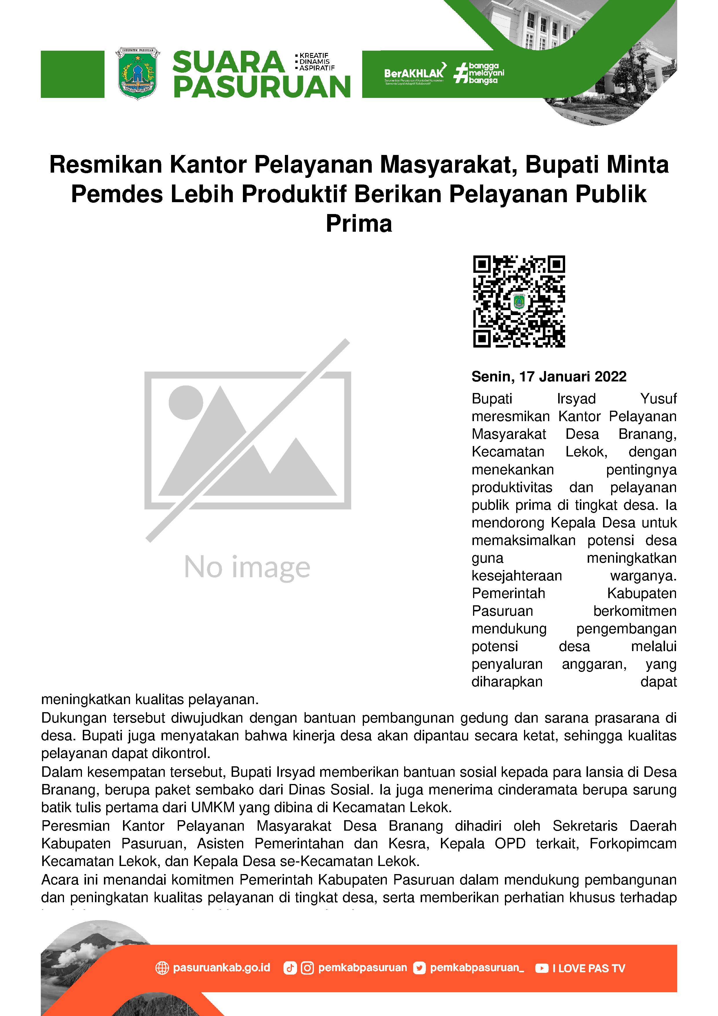 Pemerintah Desa harus lebih produktif dan aktif dalam memberikan pelayanan publik. Pernyataan itu disampaikan Bupati Irsyad Yusuf pada saat meresmikan Kantor Pelayanan Masyarakat Desa Branang, Kecamatan Lekok.