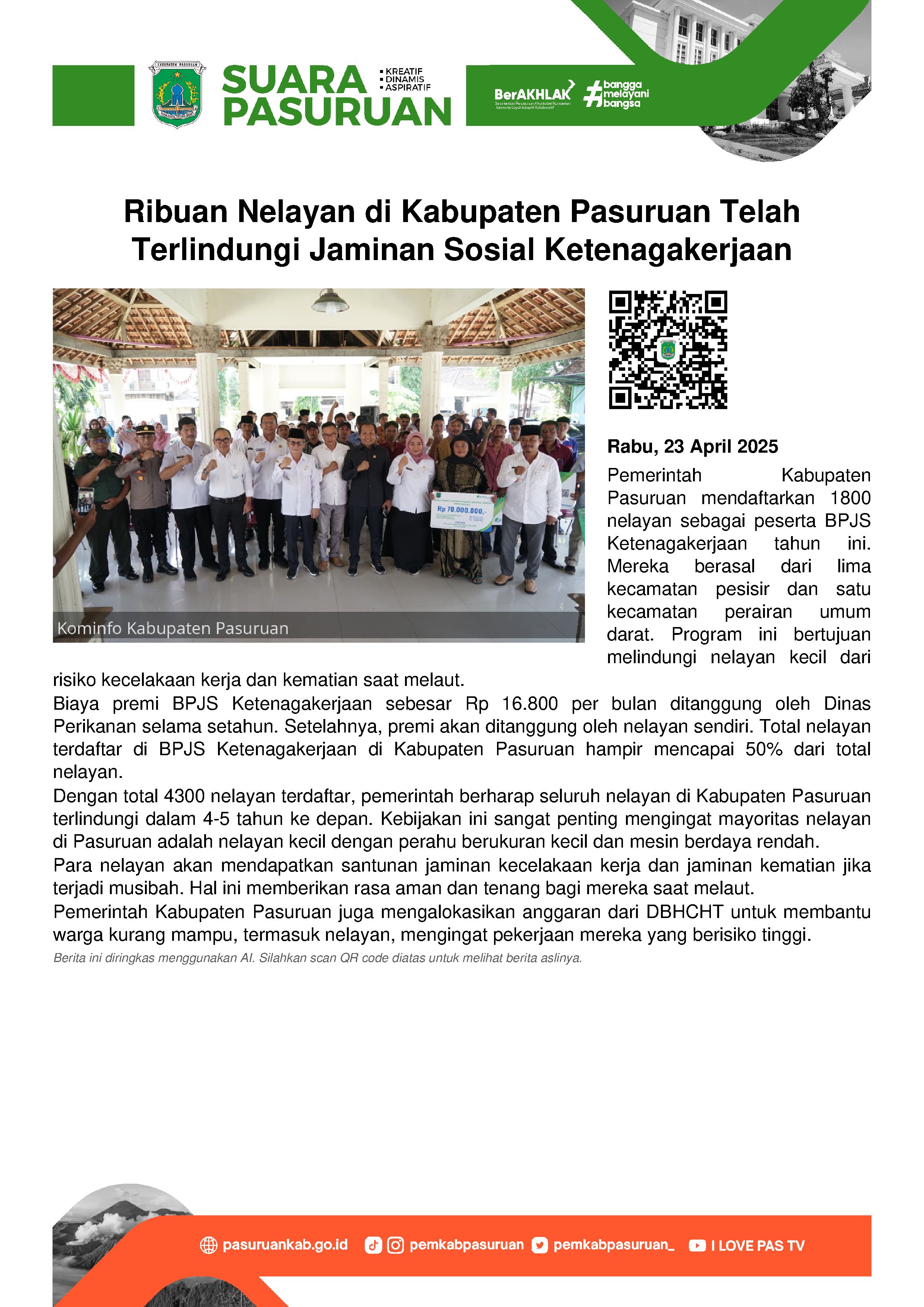 Tahun ini, Pemerintah Kabupaten Pasuruan mendaftarkan ribuan nelayan sebagai peserta BPJS Ketenagakerjaan.