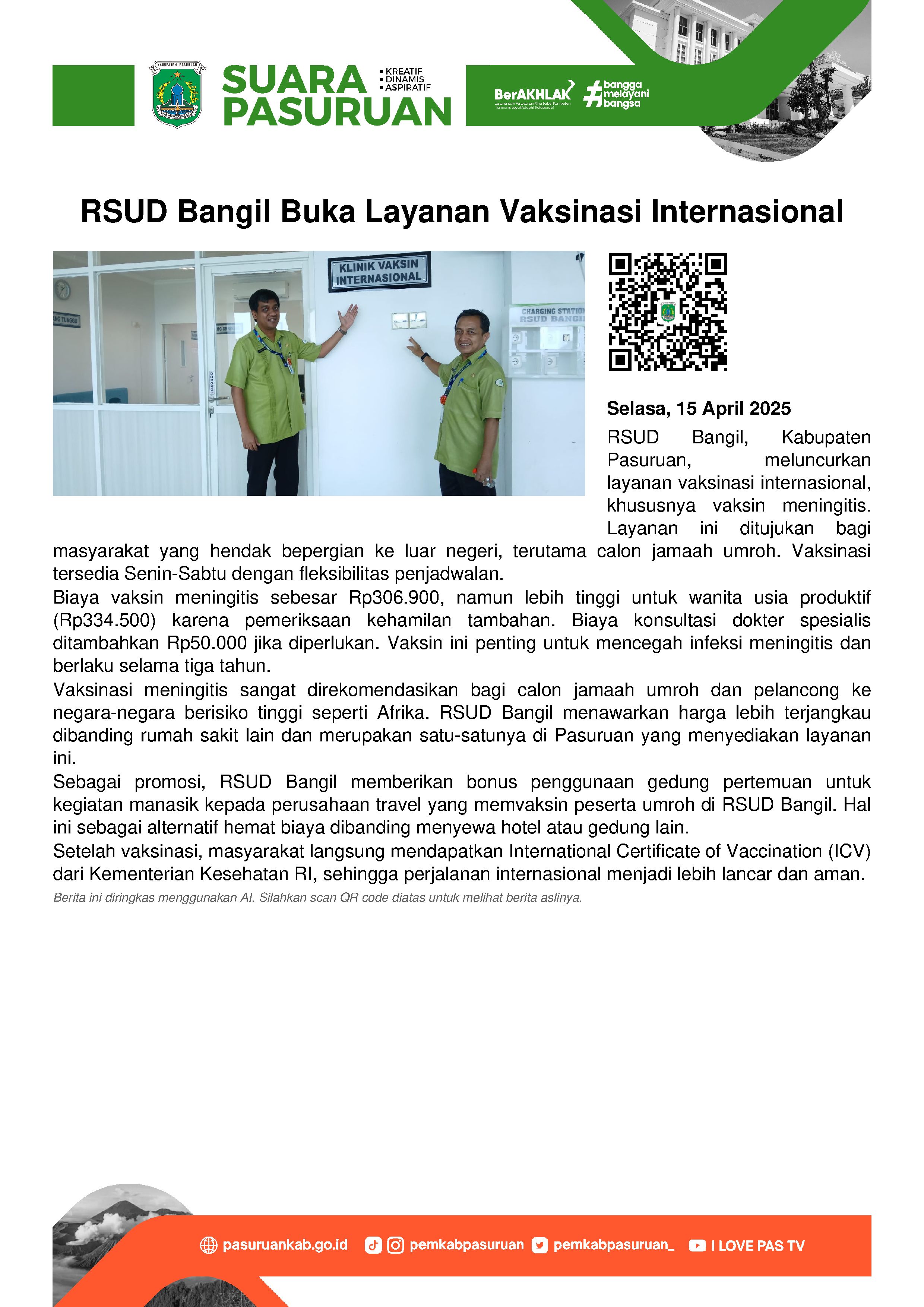 Yang terbaru, rumah sakit milik Pemerintah Daerah Kabupaten Pasuruan ini membuka Pelayanan Vaksinasi Internasional, dalam hal ini vaksin meningitis.