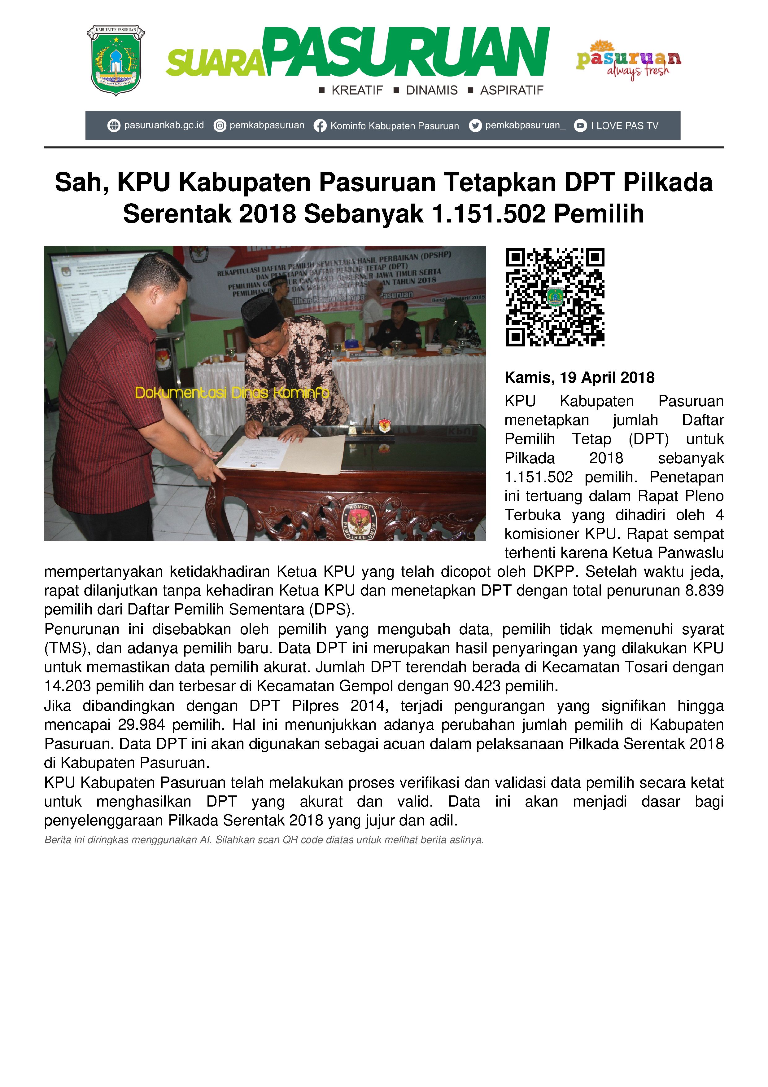 Penetapan jumlah DPT tersebut tertuang dalam Rapat Pleno Terbuka yang dilaksanakan di Aula KPU Kabupaten Pasuruan, Kamis (19/04/2018) siang, dan dihadiri 4 komisionernya, yakni Azmi Abas Jazuli, Zainul Faizin, Insan Qoriawan serta Titik Wahyuningsih.