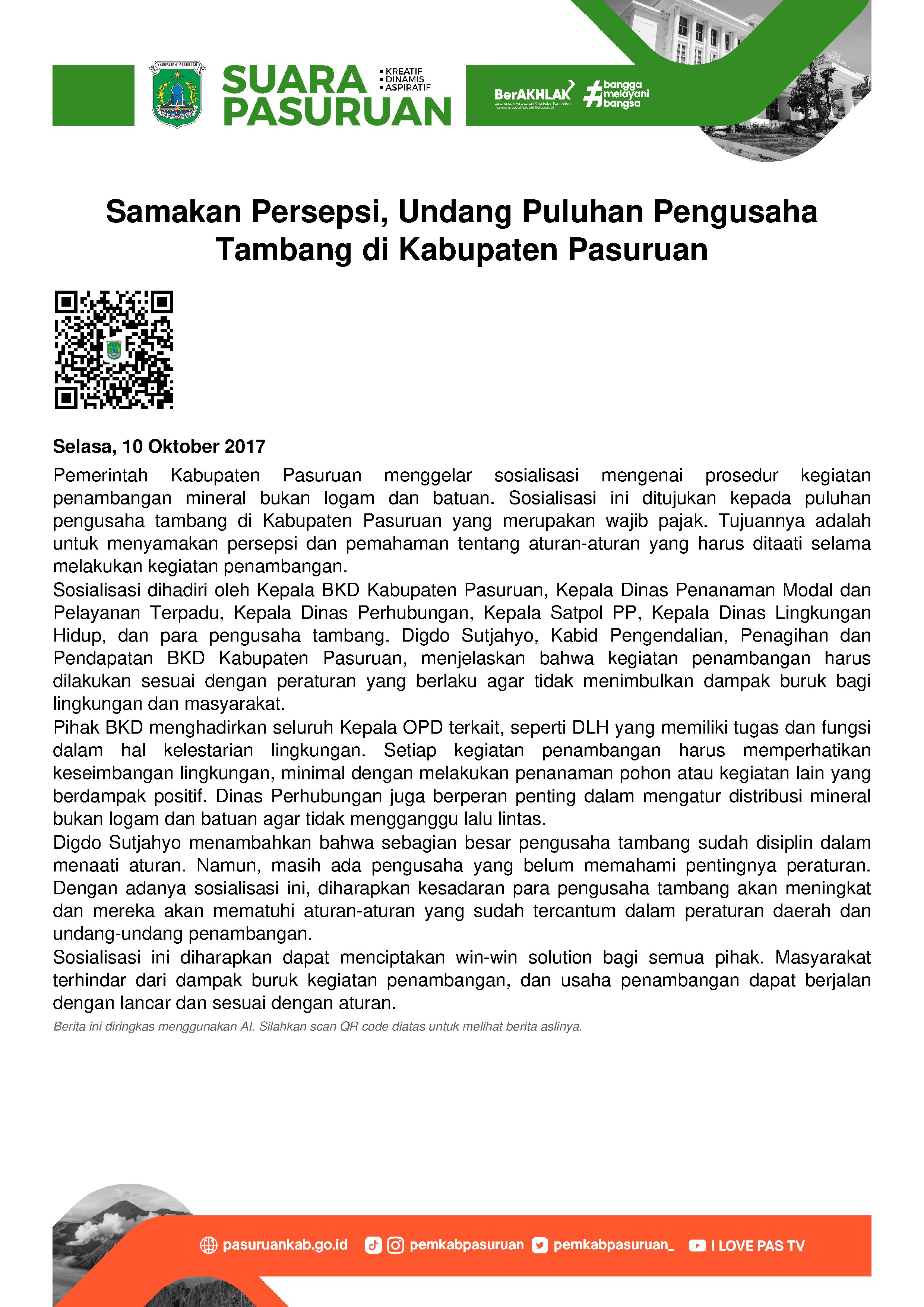 Sosialisasi tersebut dihadiri oleh Kepala BKD Kabupaten Pasuruan, Luly Noermadiono, Kepala Dinas Penanaman Modal dan Pelayanan Terpadu, Sunarto, Kepala Dinas Perhubungan, Hery Yitno, Kepala Satpol PP, Yudha Triwidya Sasongko, Kepala Dinas Lingkungan Hidup, Muchaimin, serta puluhan pengusaha tambang di Kabupaten Pasuruan.
