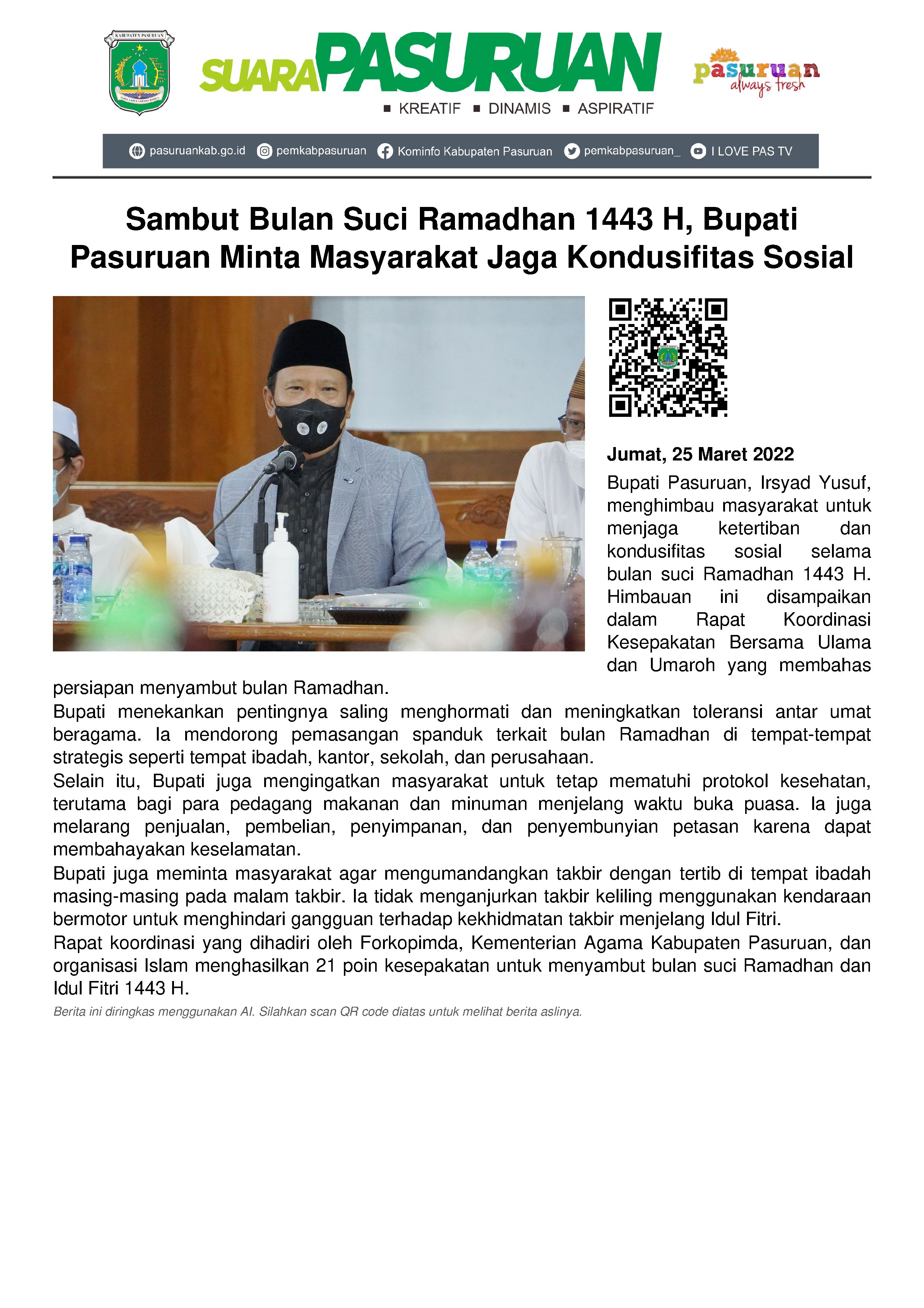 Bertempat di Gedung Serba Guna (GSG) Pemerintah Kabupaten Pasuruan pada hari Kamis (24/3/2022) malam, Bupati menyampaikan isi kesepakatan. Diantaranya ajakan kepada masyarakat agar saling menghormati saat bulan suci Ramadhan. Berikut meningkatkan toleransi antar umat beragama.