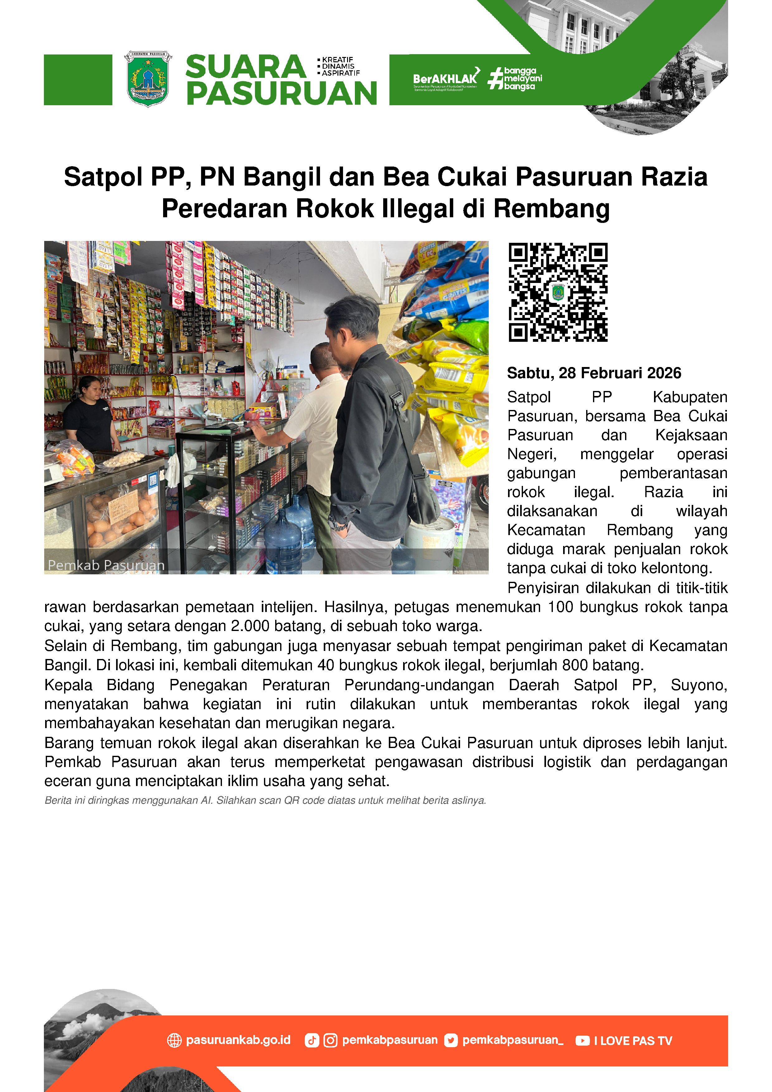 Satpol PP Kabupaten Pasuruan bersama kantor Kantor Bea Cukai Pasuruan dan Kejaksaan Negeri, menggelar operasi gabungan terhadap barang kena cukai, Jumat (27/2/2026).
