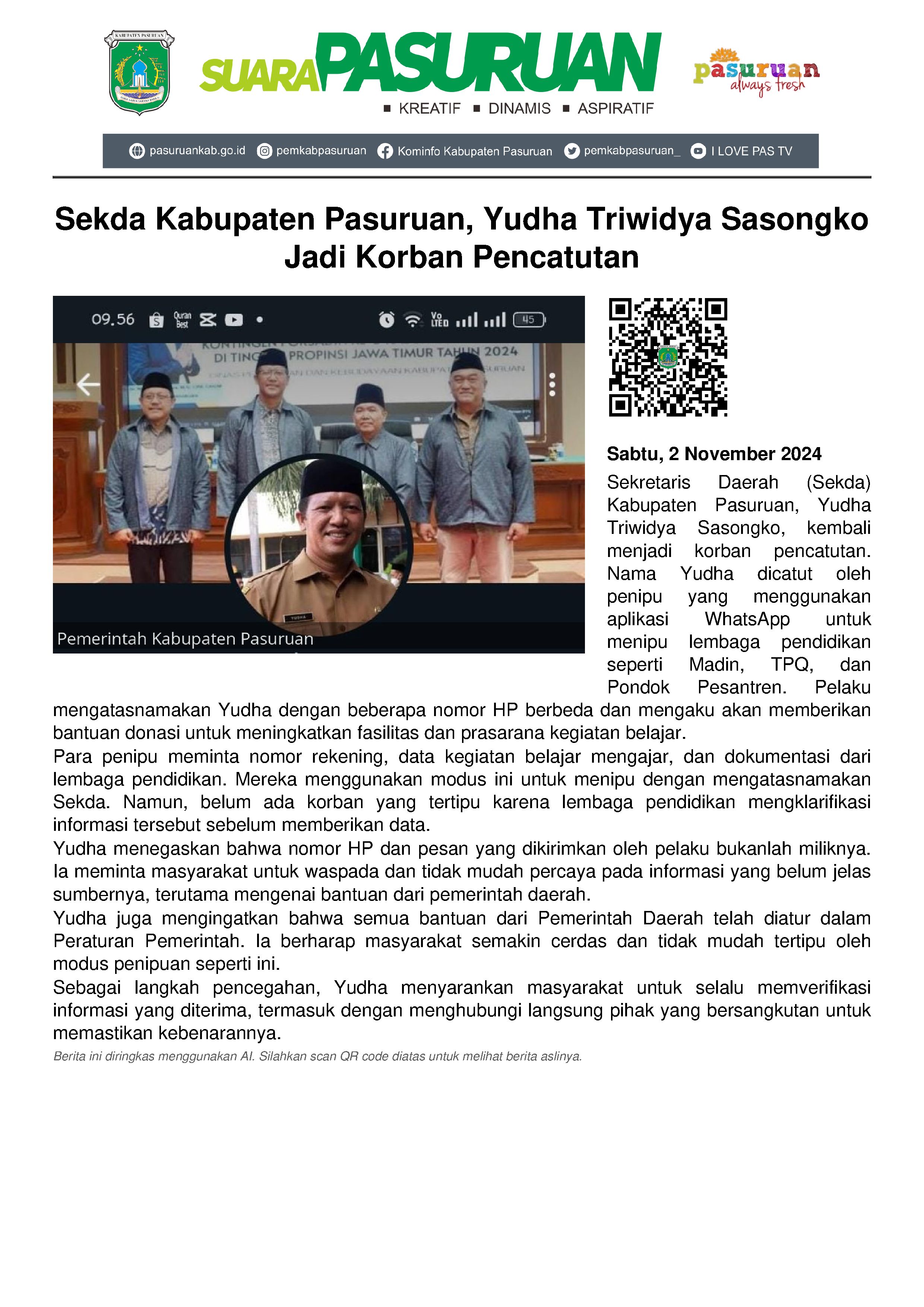 Saat dikonfirmasi Sabtu (2/11/2024), Yudha membenarkannya. Ia mengungkapkan pelaku diduga lebih dari satu orang. Sebab ada beberapa nomor HP yang seluruhnya memperkenalkan dirinya sebagai Sekda Kabupaten Pasuruan dan mengirimkan pesan kepada Lembaga Pendidikan seperti Madin, TPQ maupun Pondok Pesantren.