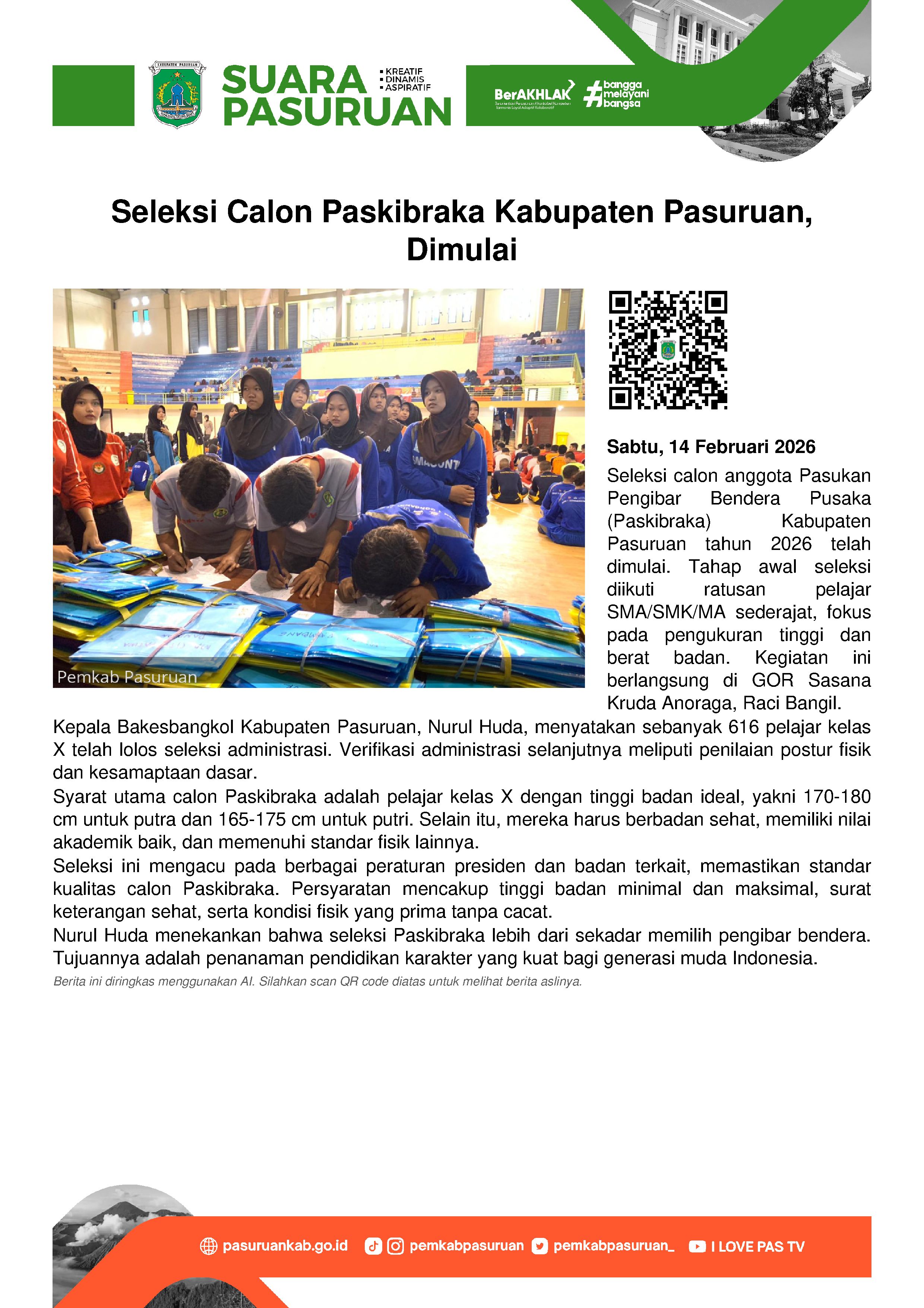 Seleksi anggota Pasukan Pengibar Bendera Pusaka (Paskibraka) di Kabupaten Pasuruan tahun 2026, dimulai.