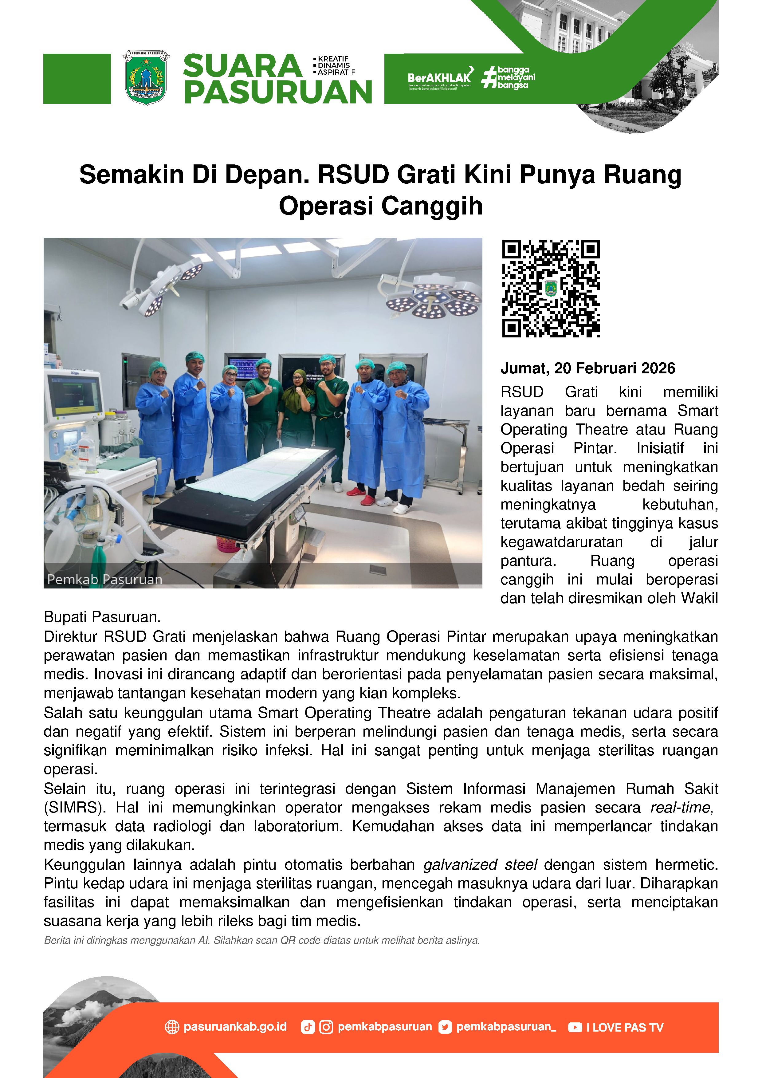 "Adanya Smart Operating Theatre ini bagian dari inovasi RSUD Grati yang adaptif dan berorientasi pada upaya penyelamatan pasien secara maksimal," kata Retno saat ditemui di ruangannya, Jumat (20/2/2026).