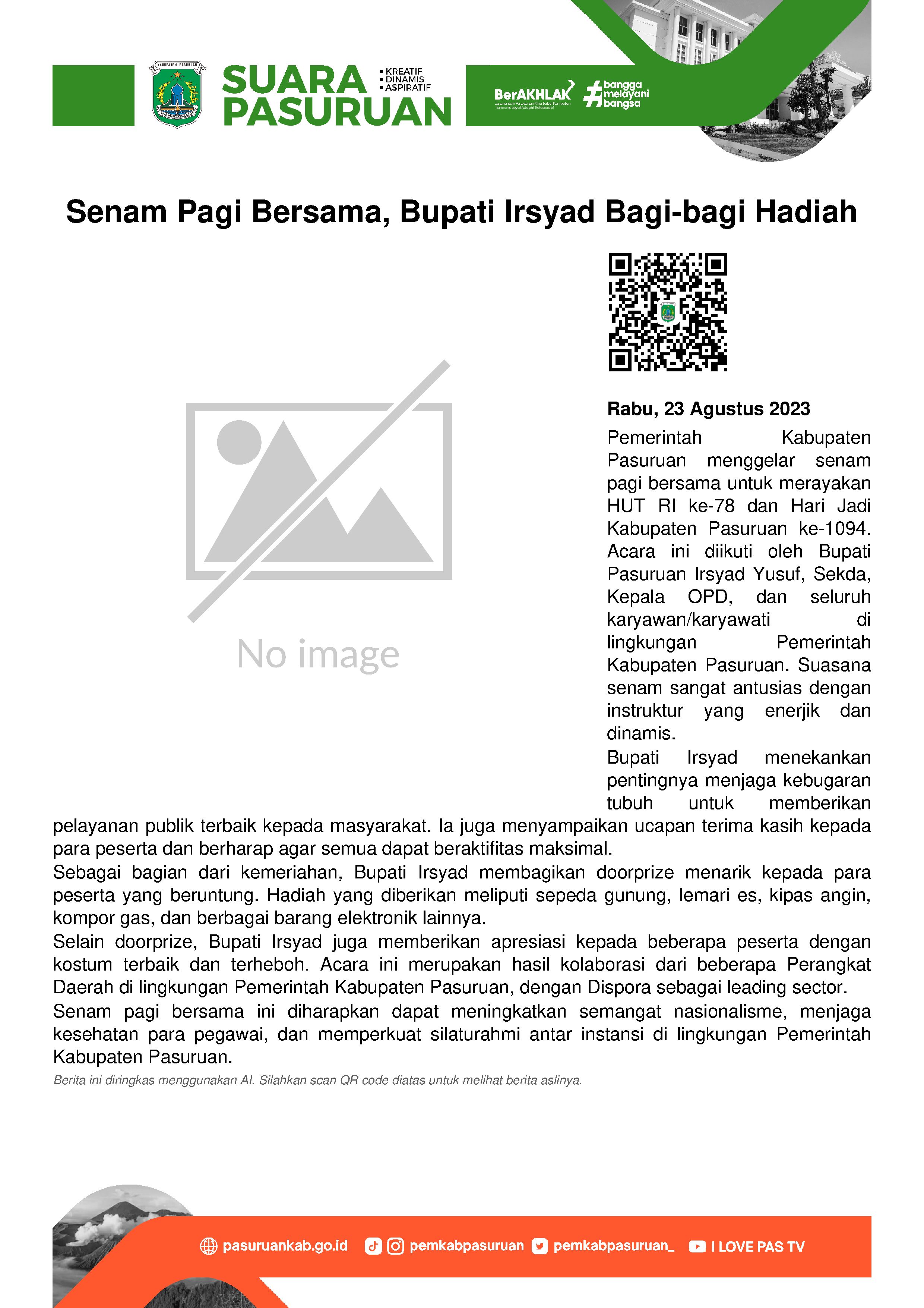 Seusai senam, Gus Irsyad demikian biasanya Bupati Pasuruan familiar disapa menyampaikan bahwa digelarnya kembali agenda senam pagi bersama sebagai upaya bersama dalam menjaga kebugaran tubuh. Selain untuk memeriahkan Hari Kemerdekaan, digelarnya satu diantara cabang olahraga yang mengkombinasikan beberapa gerakan tubuh tersebut sekaligus bertujuan agar seluruh keluarga besar Pemerintah Kabupaten Pasuruan senantiasa terjaga kebugaran dan kesehatannya. Sehingga dapat menunaikan tugas dan tanggungjawabnya dalam memberikan pelayanan publik terbaik bagi masyarakat Kabupaten Pasuruan.