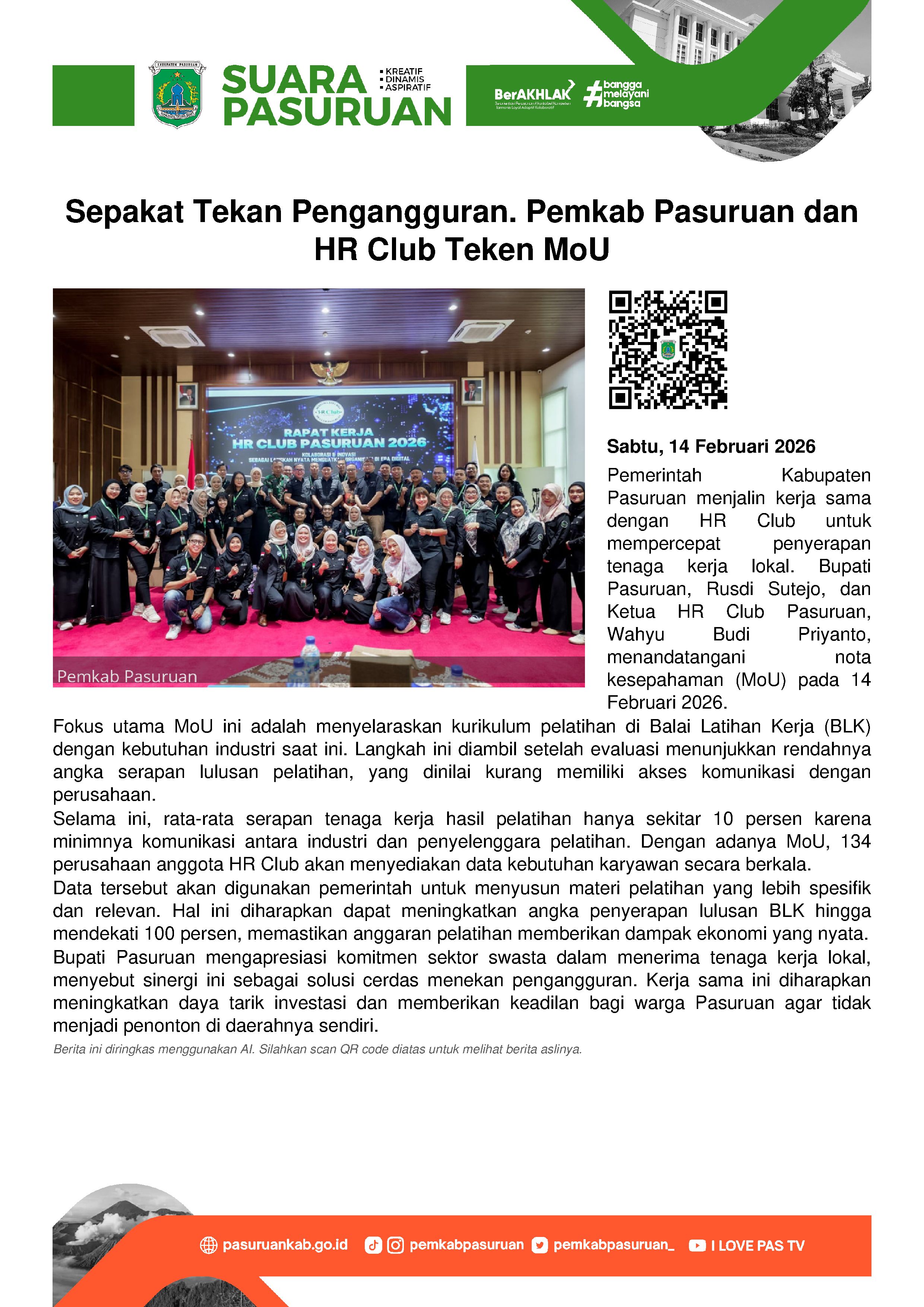 Pemerintah Kabupaten Pasuruan bersama Komunitas Pengelola Sumber Daya Manusia (HR Club) menggelar penandatanganan nota kesepahaman alias MoU, Sabtu (14/2/2026).