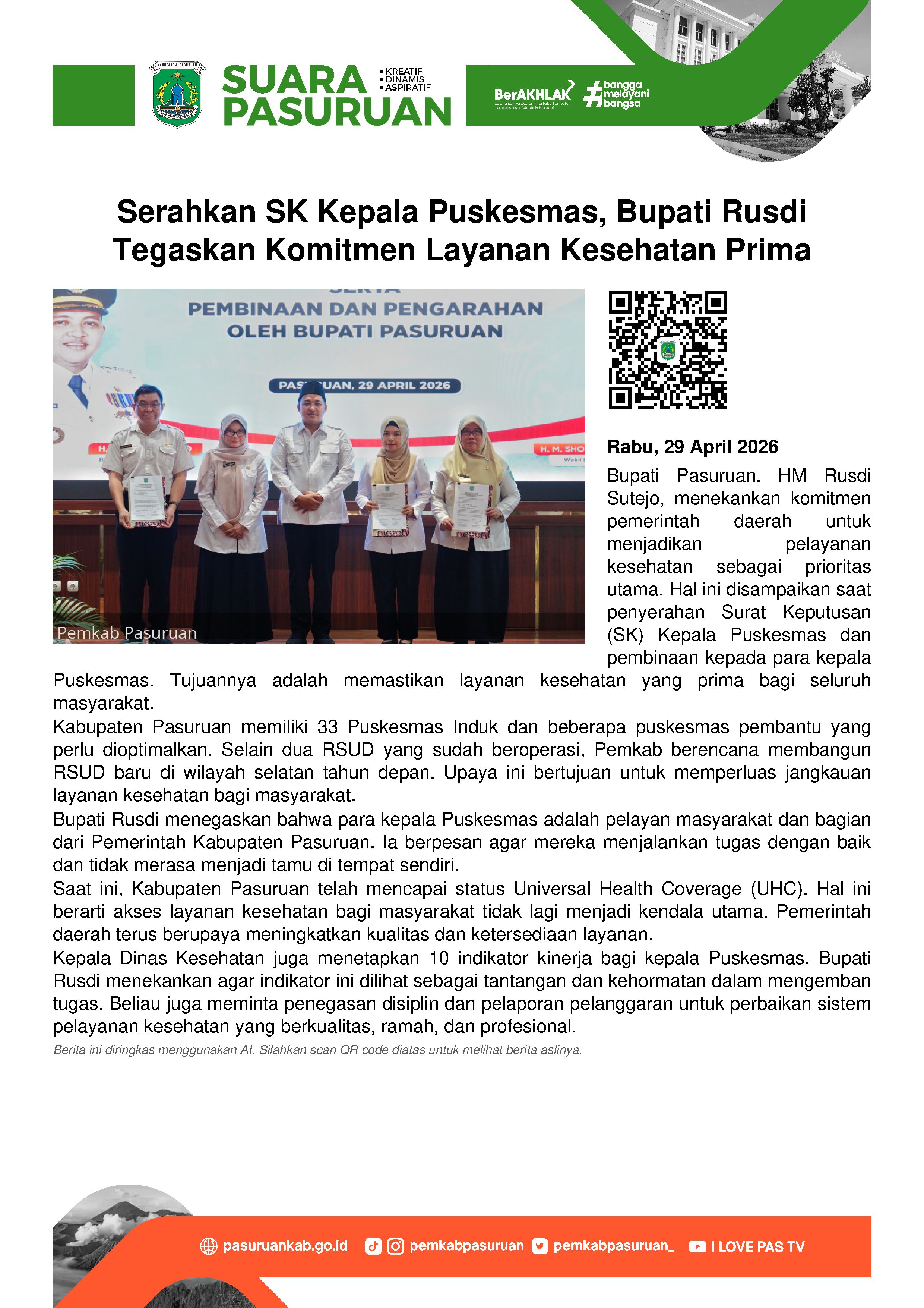 Bupati Pasuruan, HM Rusdi Sutejo menegaskan komitmen Pemerintah Kabupaten Pasuruan agar pelayanan kesehatan sebagai prioritas utama bagi seluruh masyarakat Kabupaten Pasuruan. Penegasan tersebut disampaikan saat menyerahkan Surat Keputusan (SK) Kepala Puskesmas sekaligus memberikan pembinaan dan pengarahan bagi para Kapus di Auditorium Mpu Sindok, Rabu (29/4/2025) pagi.