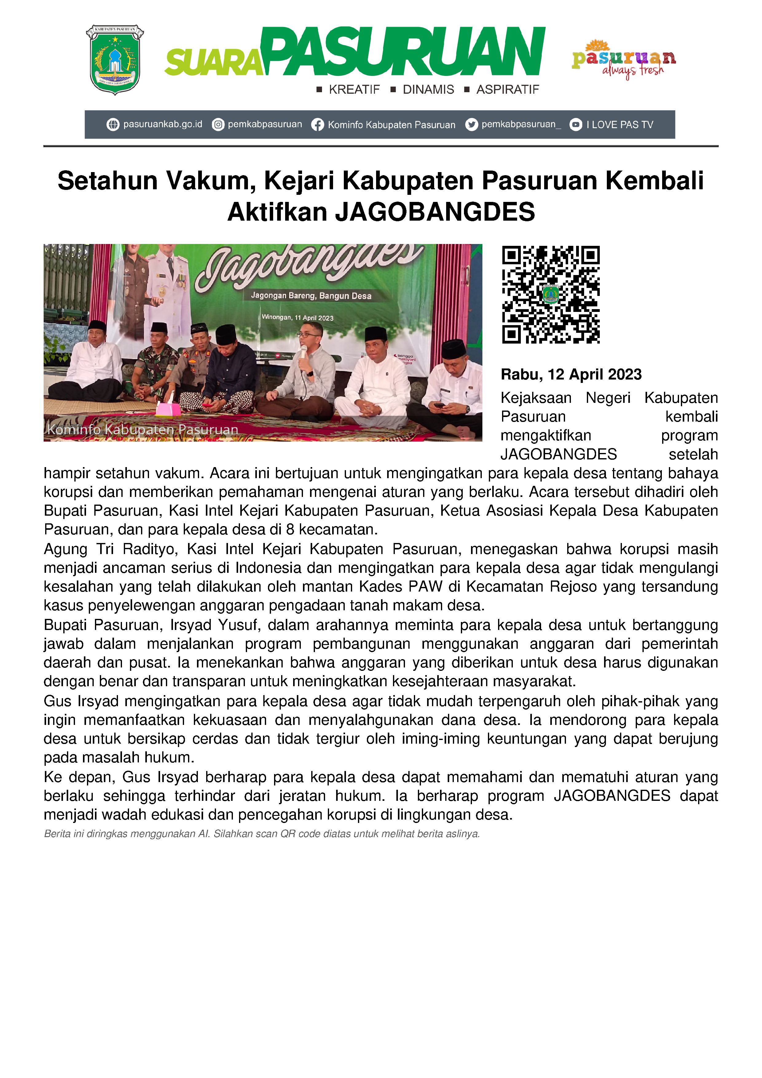 Setelah hampir setahun vakum, Kejaksaan Negeri Kabupaten Pasuruan kembali mengaktifkan JAGOBANGDES (jagongan bareng bangun desa).