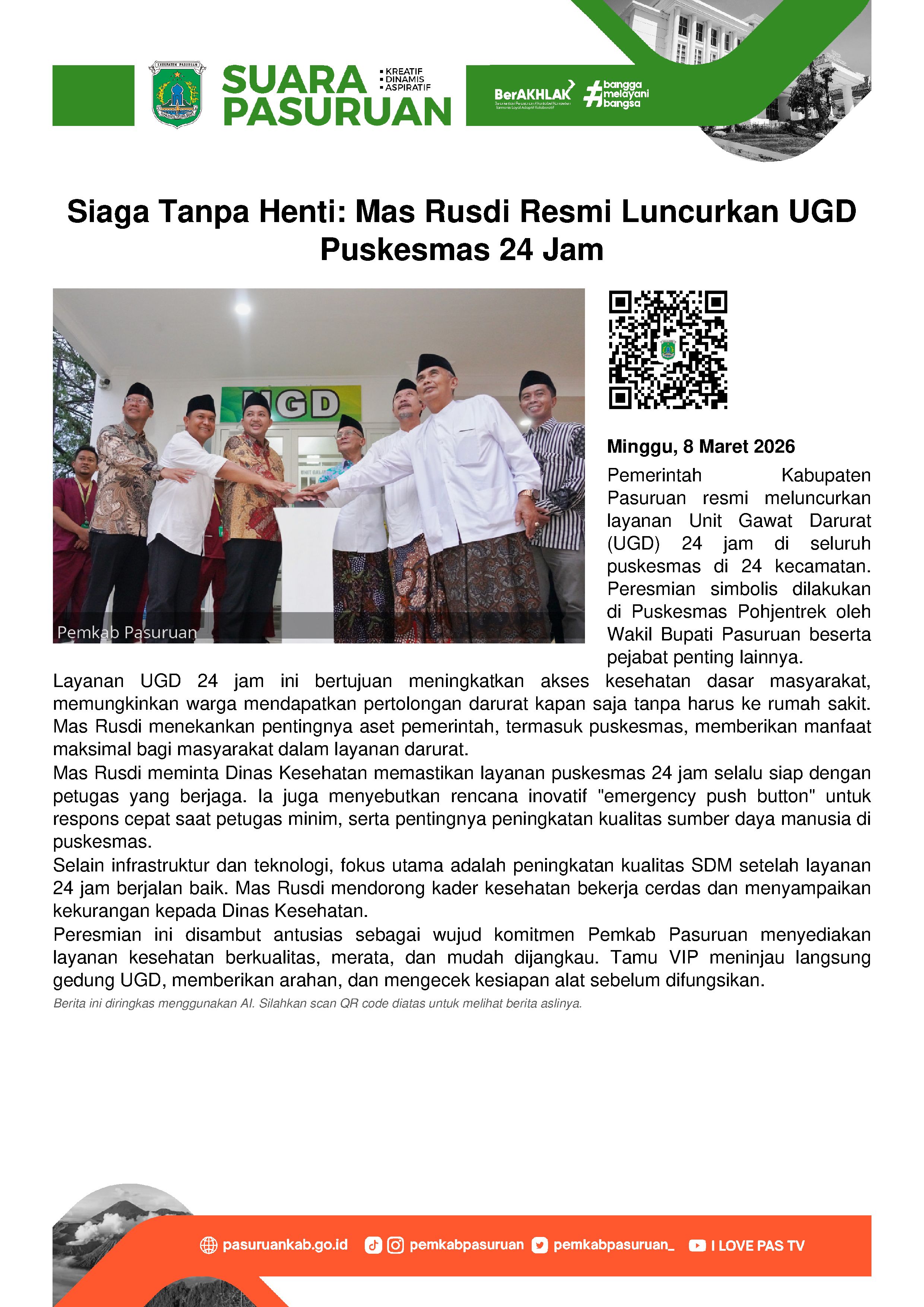 Pemerintah Kabupaten Pasuruan resmi meluncurkan layanan Unit Gawat Darurat (UGD) 24 jam di seluruh puskesmas yang tersebar di 24 kecamatan se-Kabupaten Pasuruan. Peresmian secara simbolis berlangsung pada Sabtu (7/3/26) sore di Puskesmas Kecamatan Pohjentrek.
