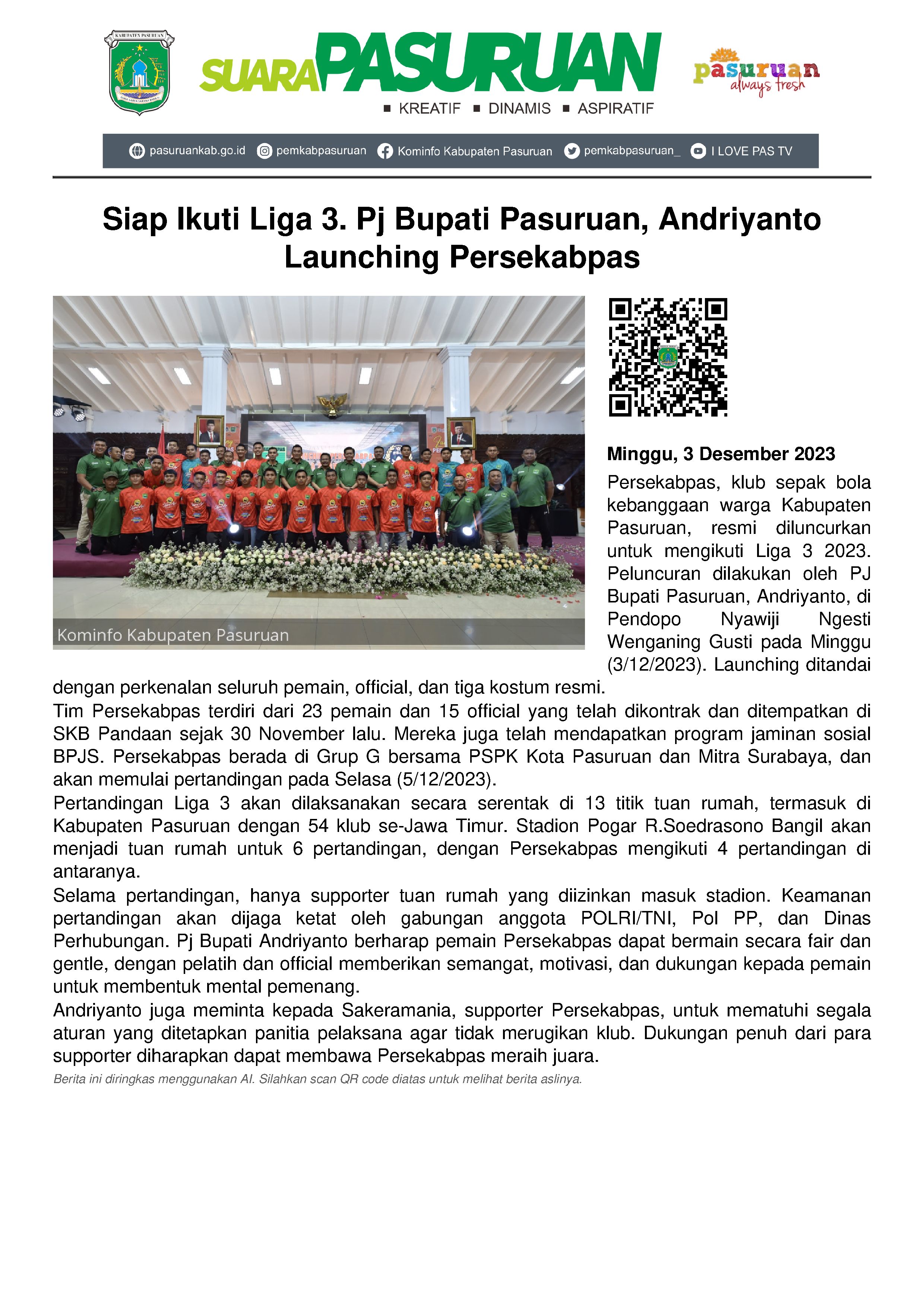 Sementara itu, Pj Bupati sekaligus Ketua Askab Pasuruan, Andriyanto menegaskan bahwa launching Persekabpas merupakan langkah penting untuk menyelamatkan The Lassak (sebutan untuk Klub Persekabpas) agar bangkit dan perlahan dapat mengejar kedidagyaan yang pernah dicapai beberapa tahun silam.