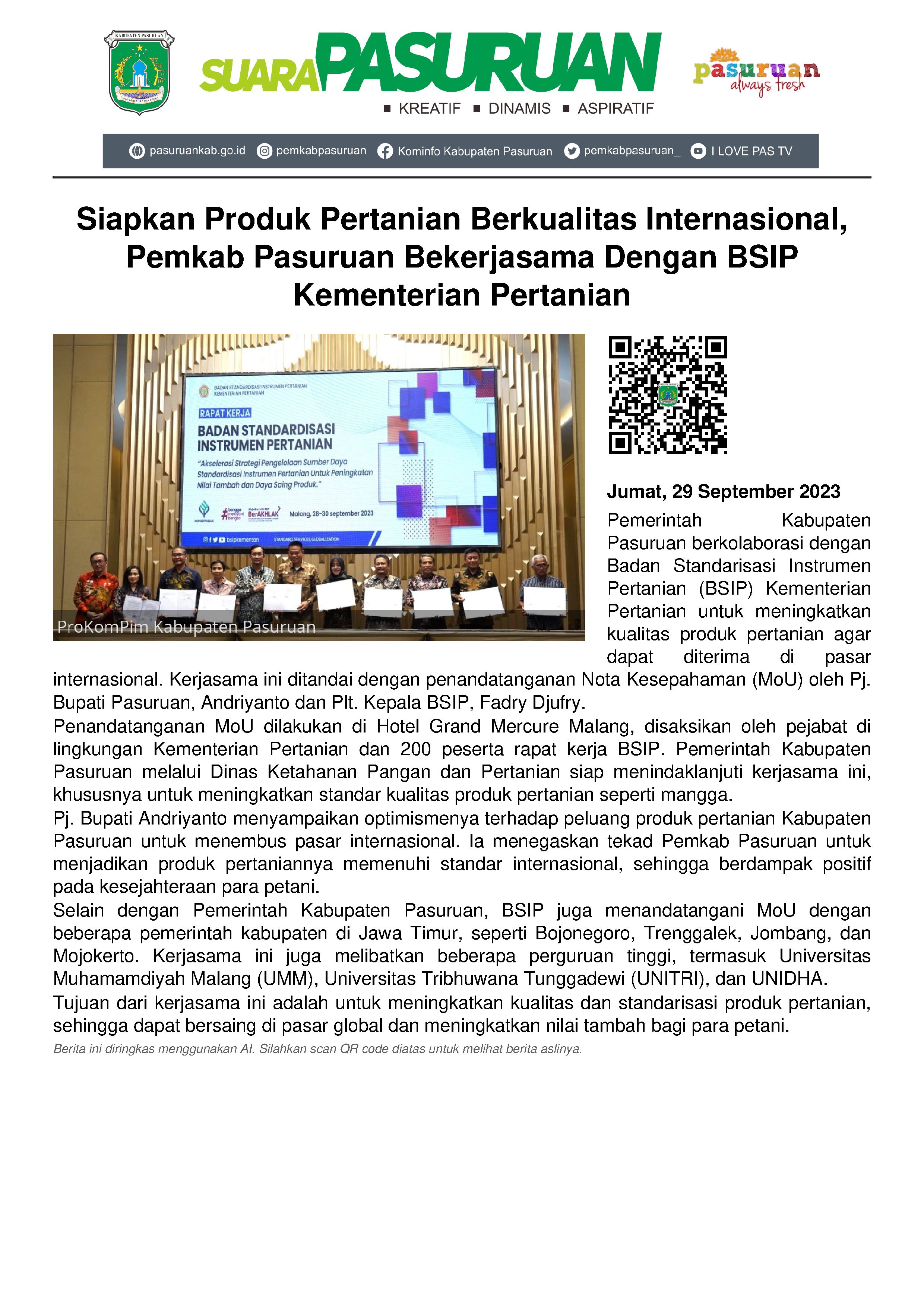 Bertempat di Hotel Grand Mercure Malang pada Kamis (28/9/2023) malam, penandatanganan kesepakatan konvensi disaksikan oleh pejabat di lingkungan Kementerian Pertanian serta 200 peserta rapat kerja BSIP. Bertema "Akselerasi Strategi Pengelolaan Sumber Daya Standarisasi Instrumen Pertanian untuk Peningkatan Nilai Tambah dan Daya Saing Produk", Pemerintah Kabupaten Pasuruan melalui Dinas Ketahanan Pangan dan Pertanian siap menindaklajuti kerjasama. Seperti yang disampaikan oleh Pj. Bupati Andriyanto dalam pernyataannya berikut ini.