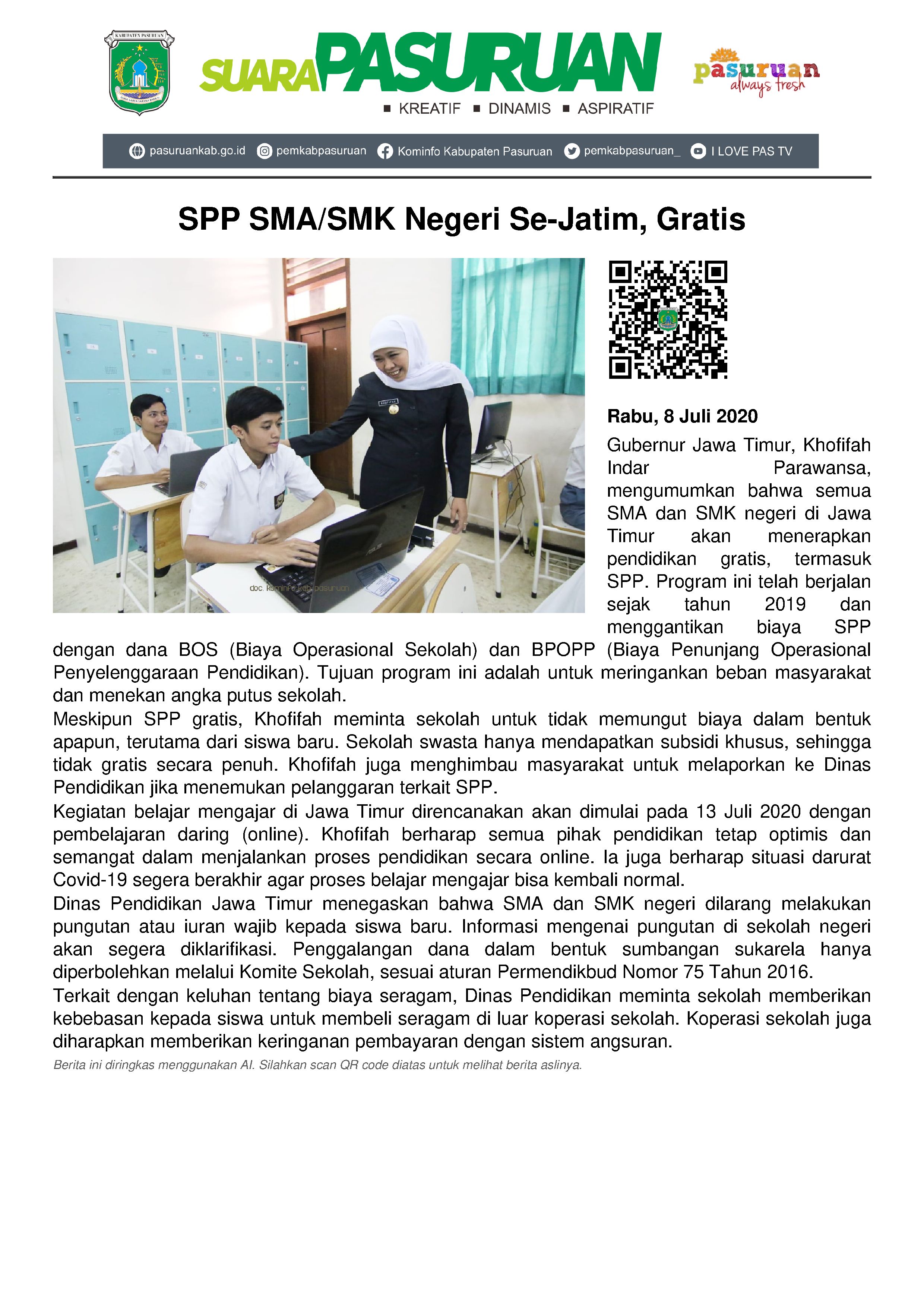 "Program SPP gratis ini sudah berjalan sejak 2019 lalu. Jadi, sekolah tidak diperkenankan memungut rupiah sepeser pun dari siswa. Semua gratis, seluruh Jatim. Penggantinya bisa dioptimalkan dari penggunaan dana BOS (Biaya Operasional Sekolah)”, tegasnya.