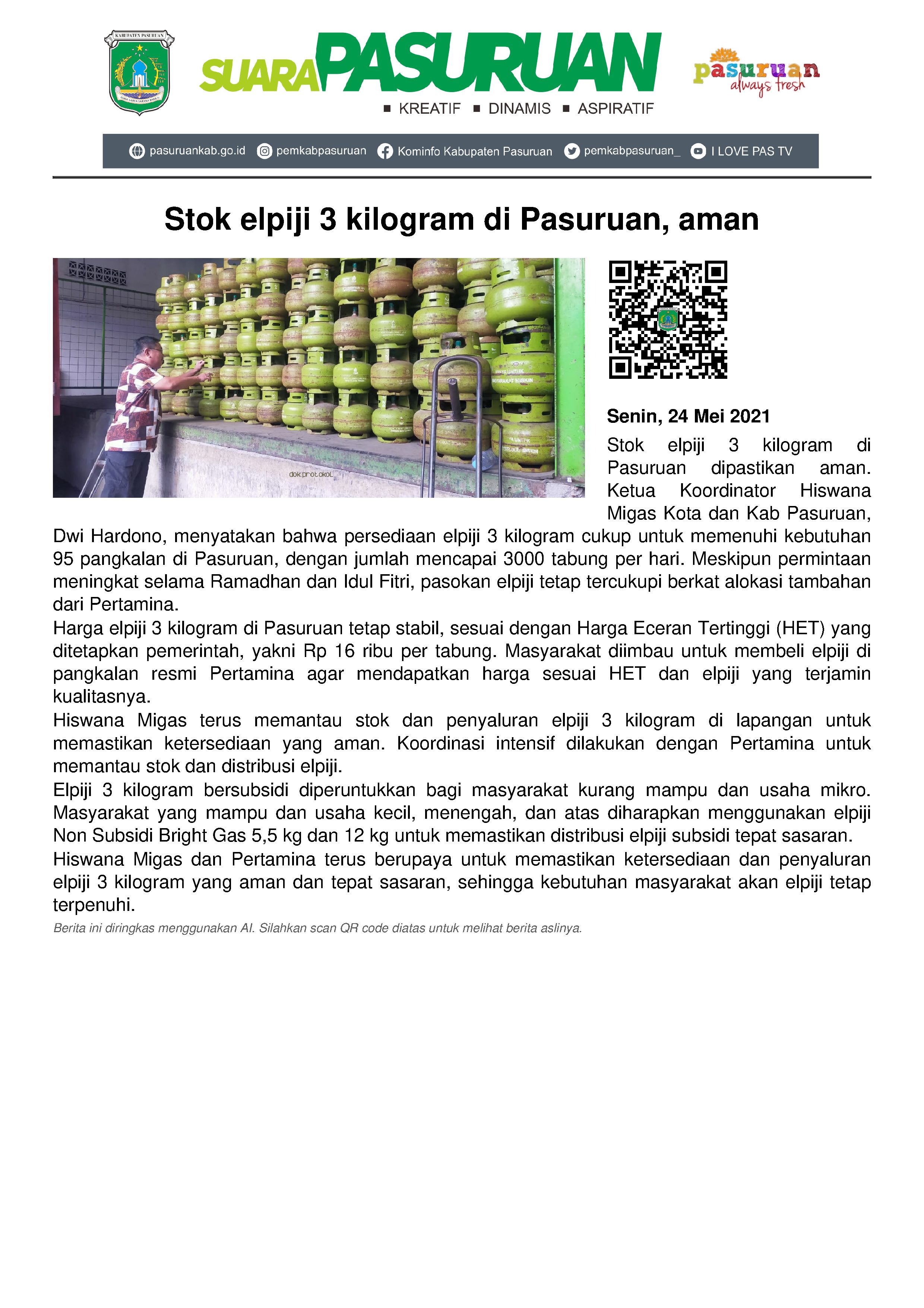 Dwi Hardono selaku Ketua Koordinator Hiswana Migas Kota dan Kab Pasuruan mengatakan, persediaan elpiji 3 kilogram masih mencukupi untuk 95 pangkalan yang ada di Kota maupun Kabupaten Pasuruan.