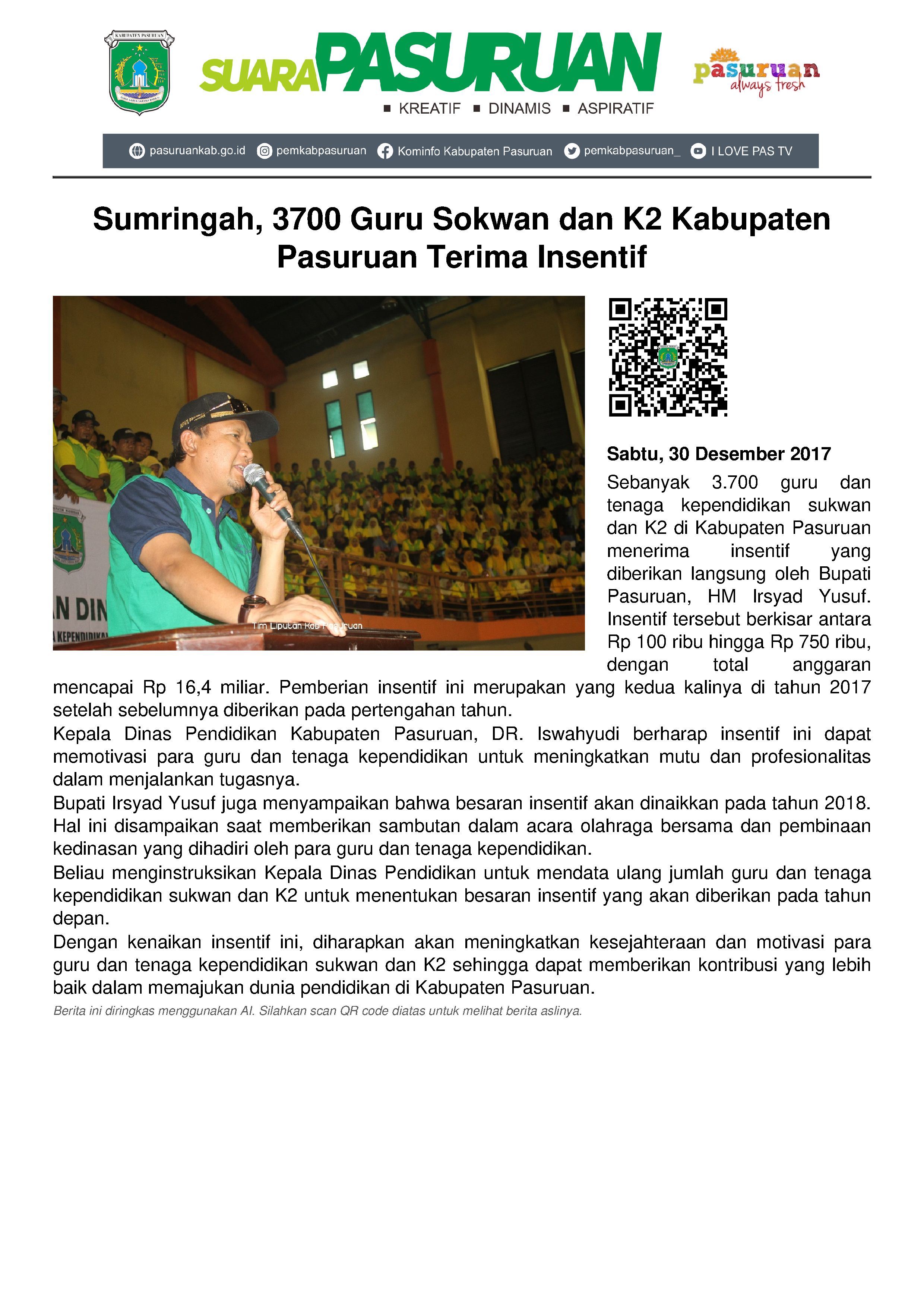 Sementara itu, Bupati Irsyad Yusuf menegaskan bahwa insentif para guru sukwan dan K2 akan dinaikkan tahun 2018 mendatang. Hanya saja, besaran nilai yang diberikan masih belum disampaikan, lantaran masih dihitung dengan kemampuan APBD Kabupaten Pasuruan.