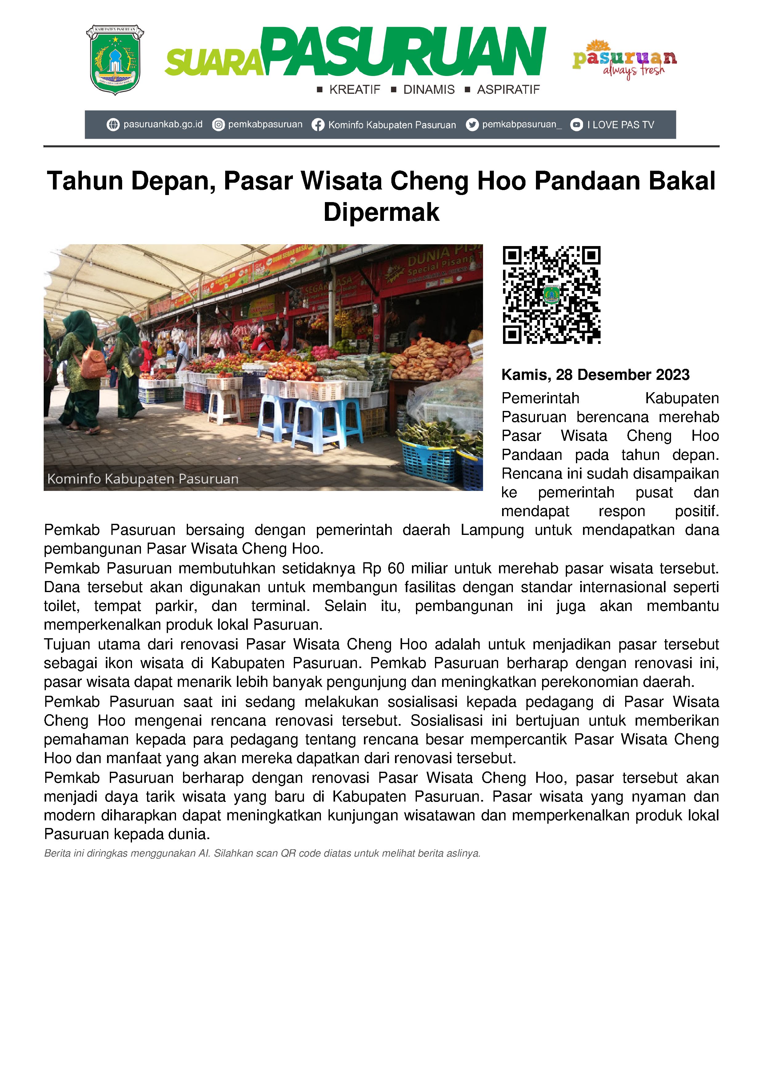 âPengunjung yang datang akan terintegrasi satu sama lain. Tempat parkir yang luas, terminal, dan juga Pasar Wisata Cheng Hoo sendiri. Selain memudahkan pengunjung, pembangunan ini nantinya akan lebih memperkenalkan produk lokal yang ada di Pasuruan,â imbuh Pj Bupati.