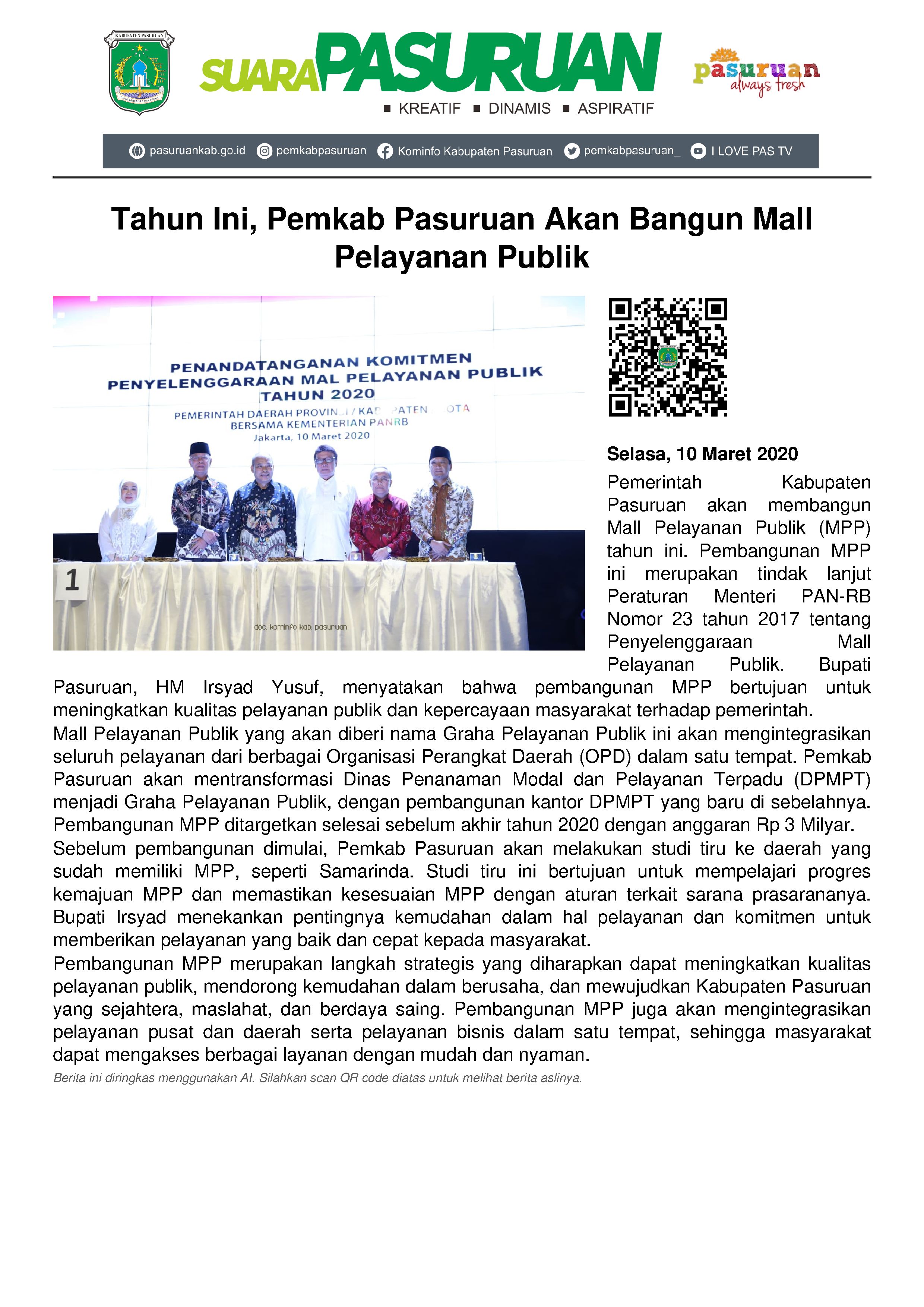 Pembangunan mall pelayanan public ini diawali dengan penandatanganan komitmen penyelenggaraan Mall Pelayanan Publik tahun 2020 antara MenPAN RB, Tjahjo Kumolo dengan Bupati Pasuruan, HM Irsyad Yusuf serta 48 Gubernur/Walikota/Bupati di Indonesia yang akan mewujudkan Mall Pelayanan Publik, di Kantor Kementrian PAN-RB, Jakarta, Selasa (10/03/2020).