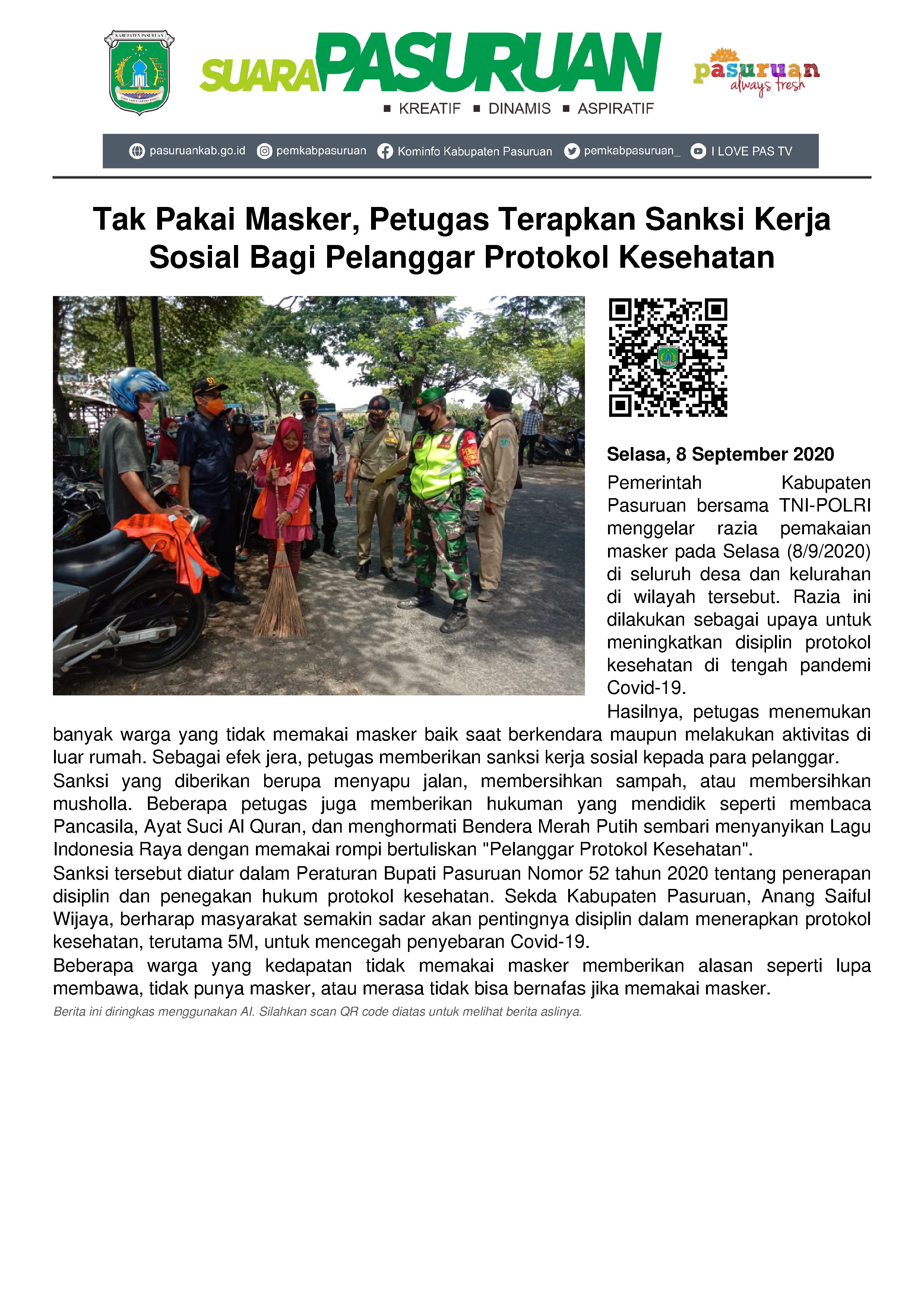 Sekretaris Daerah (Sekda) Kabupaten Pasuruan, Anang Saiful Wijaya mengatakan, kerja social yang diberikan kepada warga diantaranya menyapu jalan, membersihkan sampah dan selokan, membersihkan musholla. Namun, beberapa petugas juga memberikan hukuman yang mendidik seperti membaca Pancasila, Ayat Suci Al Qur’an dan Hormat terhadap Bendera Merah Putih sembari menyanyikan Lagu Indonesia Raya dengan memakai rompi bertuliskan “Pelanggar Protokol Kesehatan”.