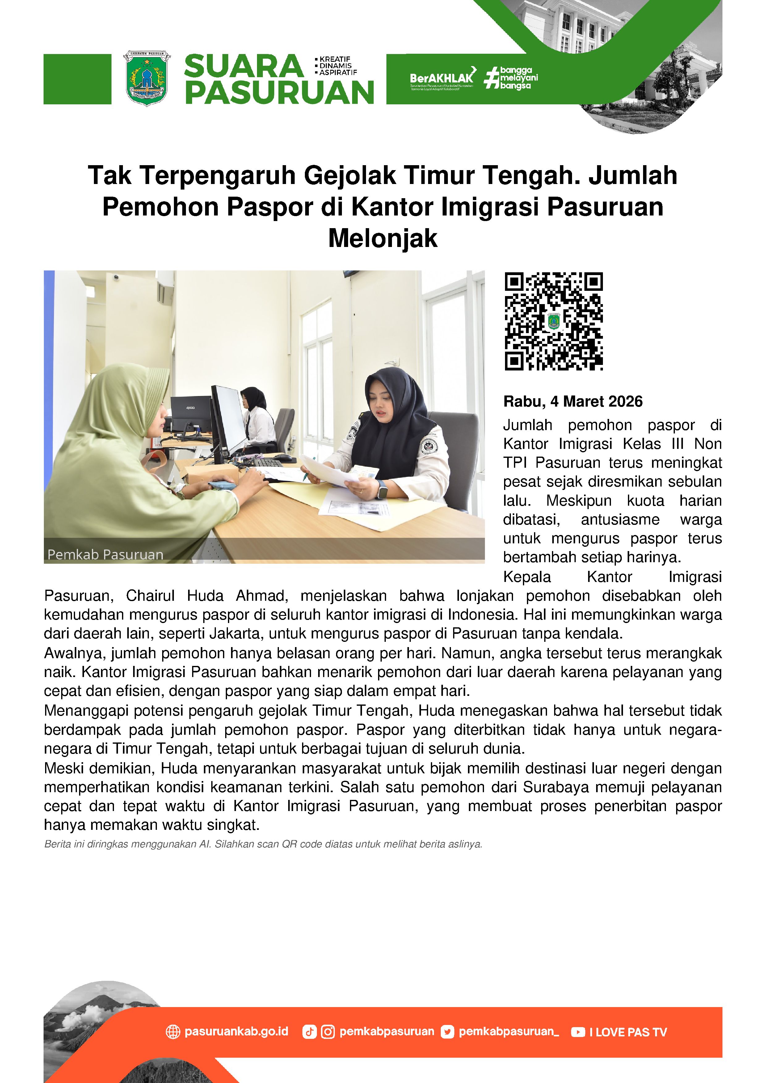 "Karena ngurus paspor bisa di semua kantor imigrasi. Jadi kalau dari jakarta mau ngurus di Kantor Imigrasi Pasuruan boleh-boleh saja," kata Huda saat ditemui di ruangannya, Rabu (4/3/2026).