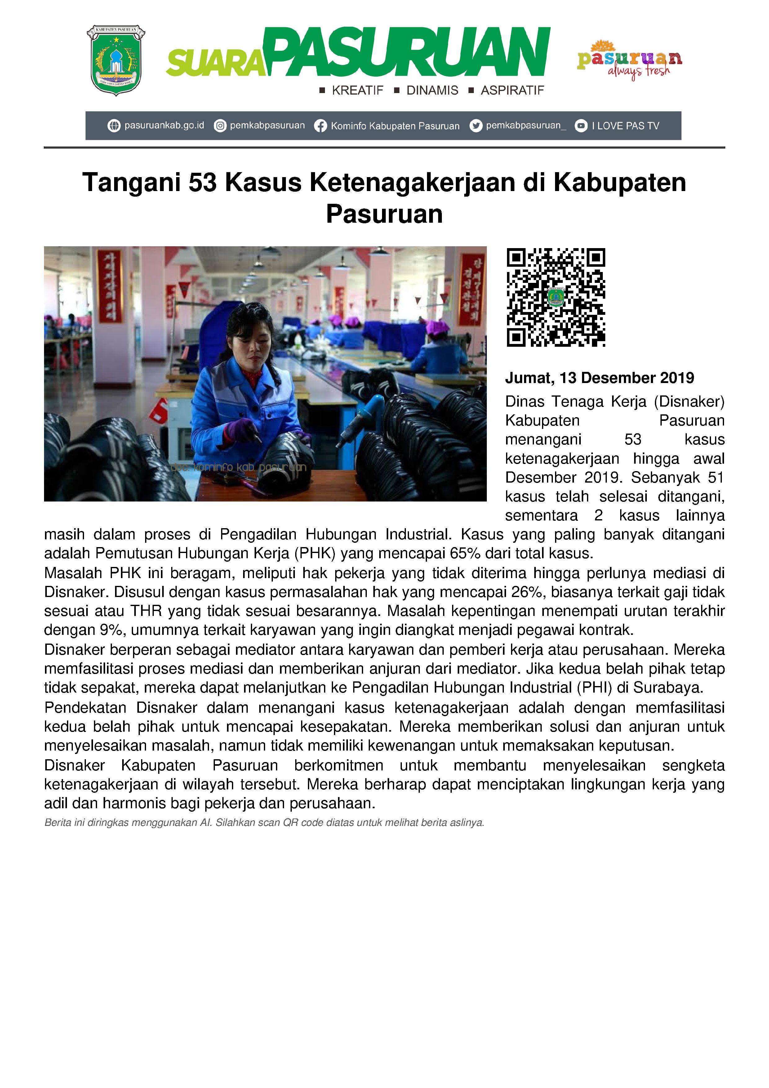 Sampai awal Desember lalu, Dinas Tenaga Kerja (Disnaker) Kabupaten Pasuruan menangani sebanyak 53 kasus ketenagakerjaan. Dari jumlah tersebut paling banyak adalah kasus Pemutusan Hubungan Kerja (PHK) yang mencapai 65 persen.