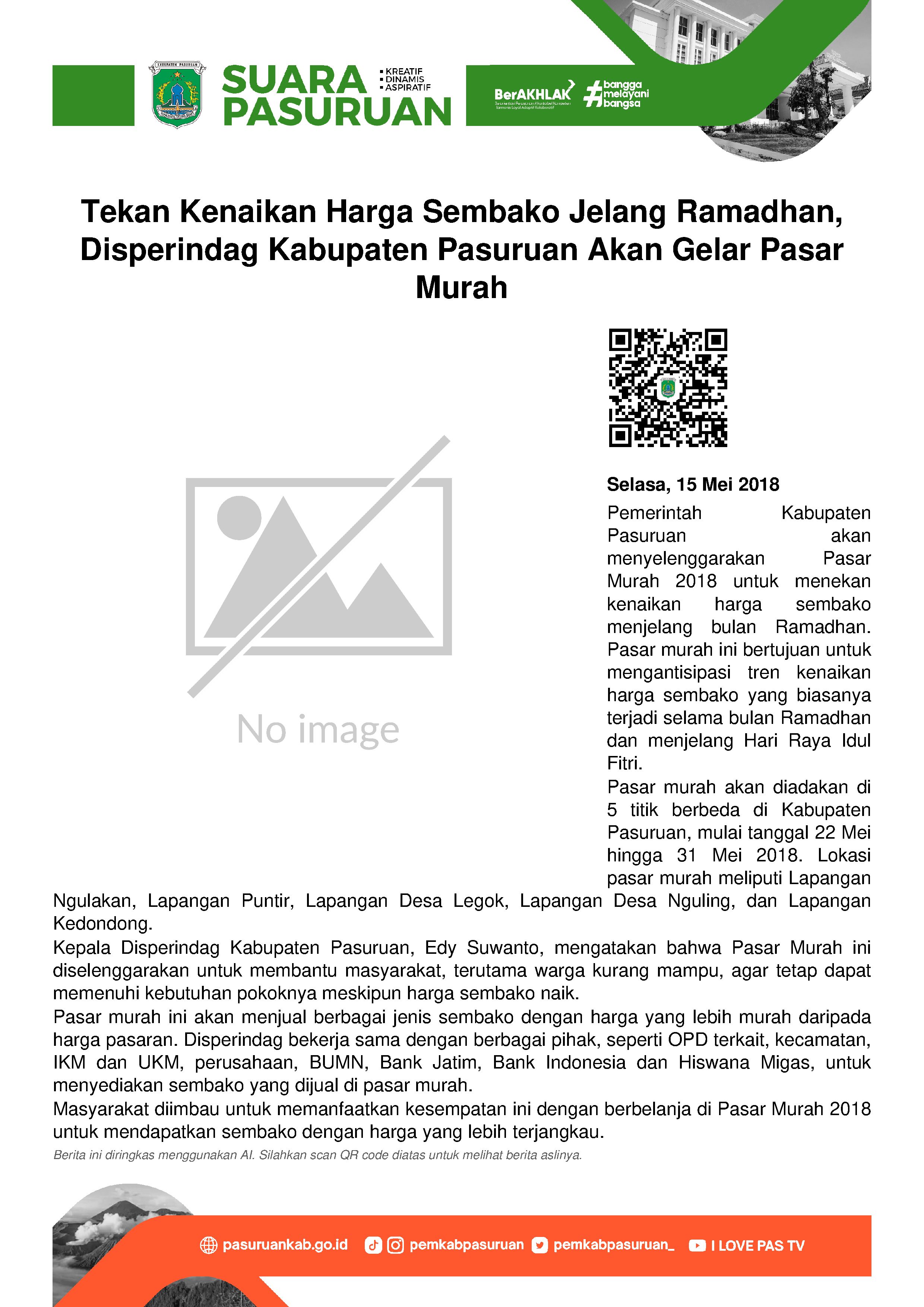 Untuk mengantisipasi lonjakan harga sembako di bulan Ramadhan, Pemerintah Kabupaten Pasuruan melalui Dinas Perindustrian dan Perdagangan (Disperindag) Kabupaten Pasuruan akan menggelar Pasar Murah 2018.
