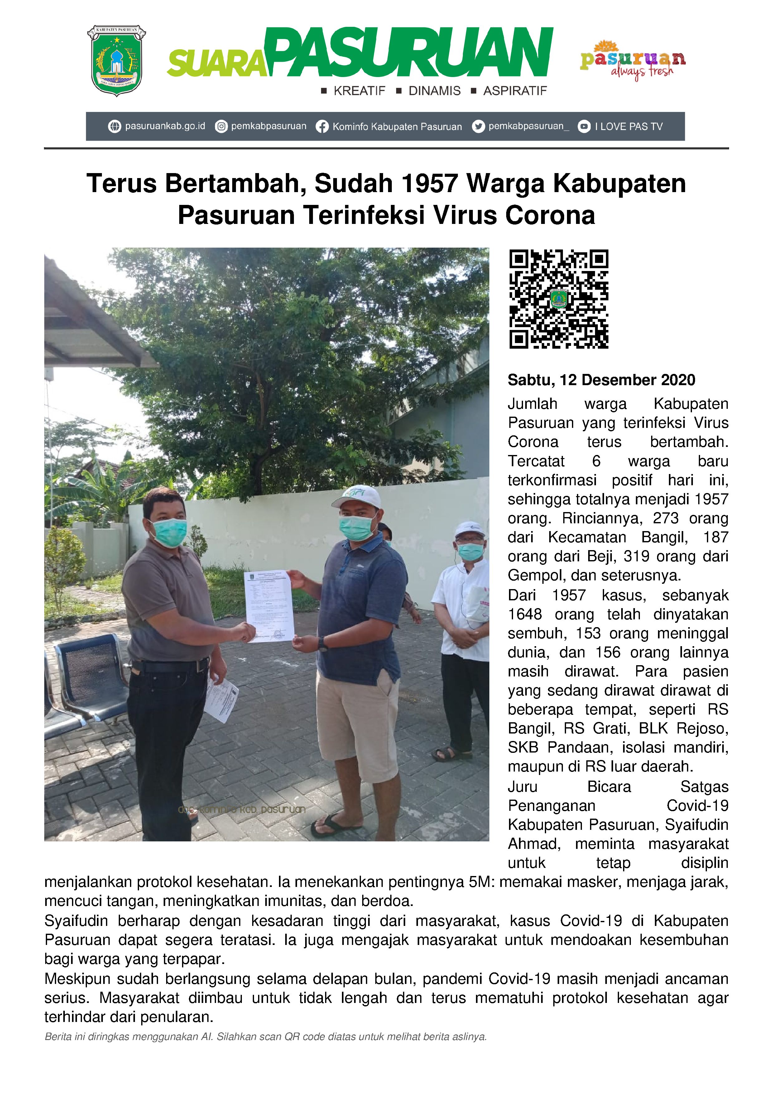 Juru Bicara Satgas Penanganan Covid-19 Kabupaten Pasuruan, Syaifudin Ahmad perlu menyampaikan hal tersebut, lantaran setiap harinya selalu ada warga yang terpapar Virus Corona.
