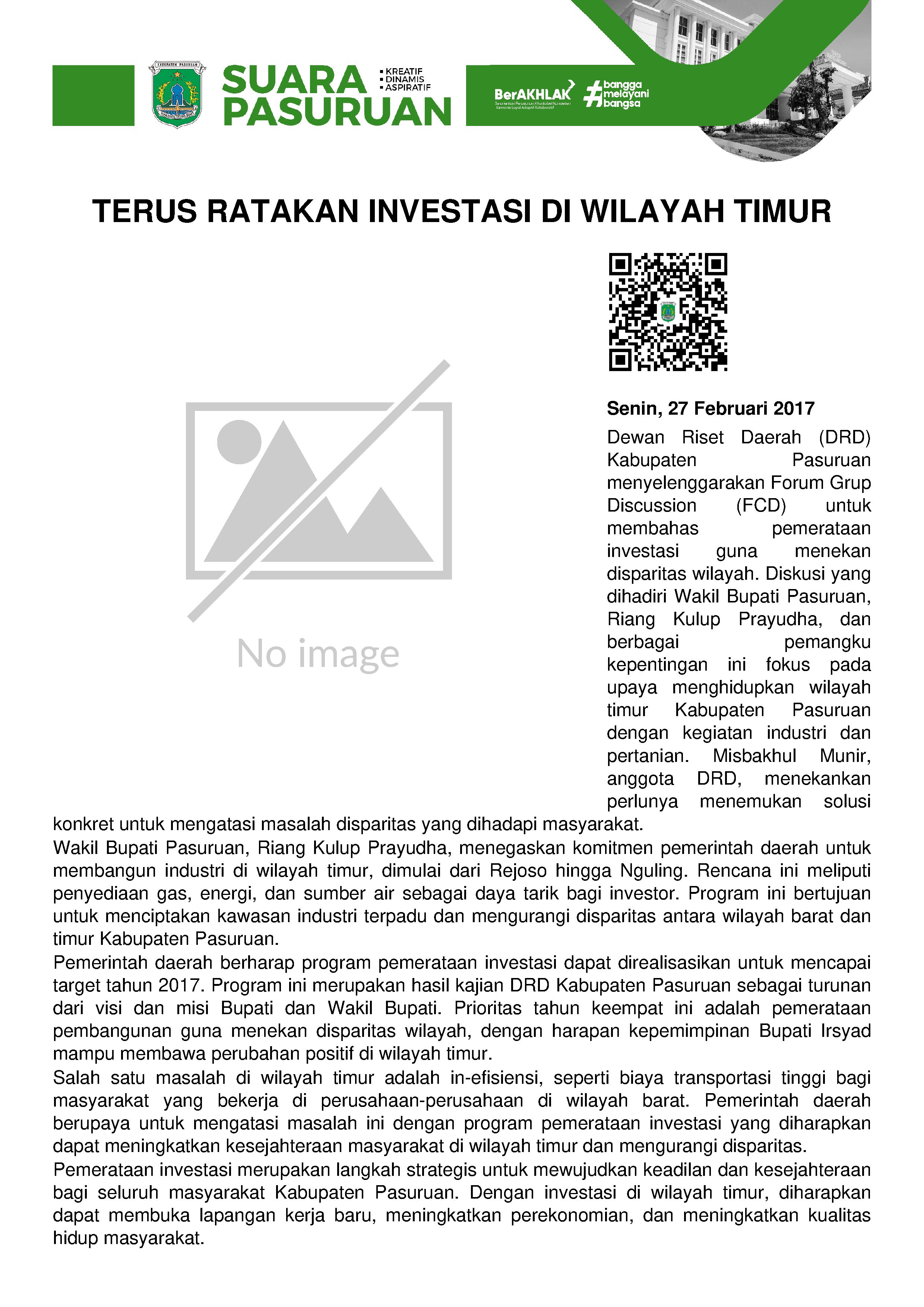 “Kami sudah mengarahkan wilayah timur sebagai kawasan industry terpadu, sehingga permasalahan disparitas antara wilayah barat dan timur Kabupaten Pasuruan akan segera terselesaikan. Fokus pada tahun 2017 adalah pemerataan investasi dalam rangka mengurangi disparitas wilayah,” ucap Gagah di hadapan peserta dialog.