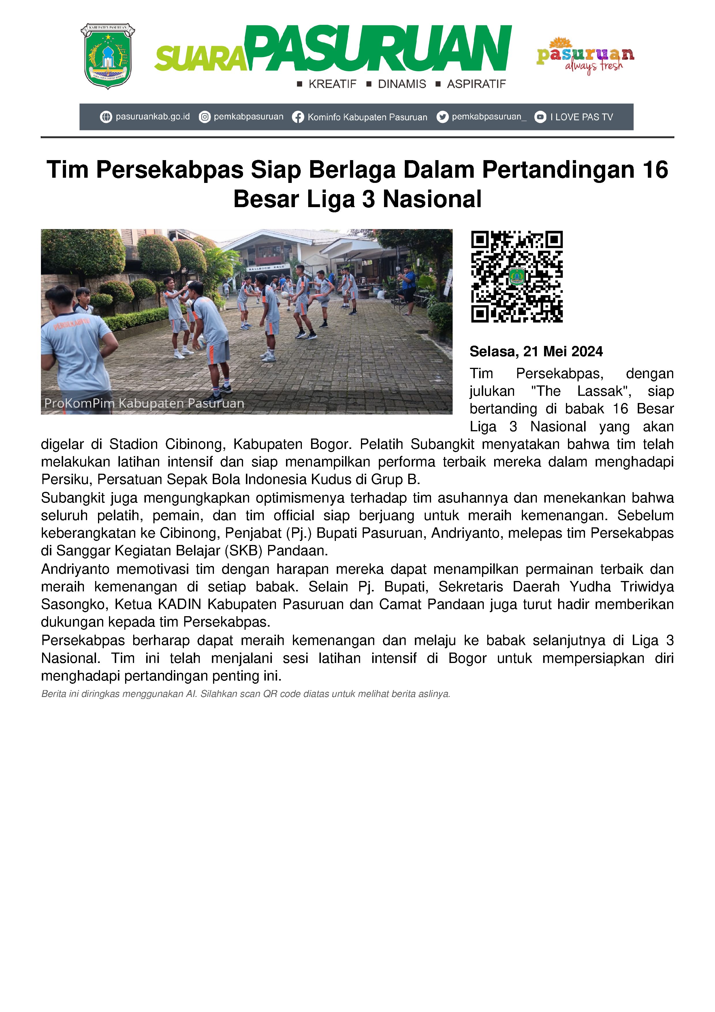 Diberitakan sebelumnya, menjelang keberangkatan Tim Persekabpas untuk bertarung di laga 16 Besar Liga 3 Nasional, Penjabat (Pj.) Bupati Pasuruan, Andriyanto melepas keberangkatannya ke Cibinong, Kabupaten Bogor dari Sanggar Kegiatan belajar (SKB) Pandaan pada hari Sabtu (18/5/2024) malam. Baik pemain, pelatih maupun tim official Persekabpas diajak tampil penuh totalitas.