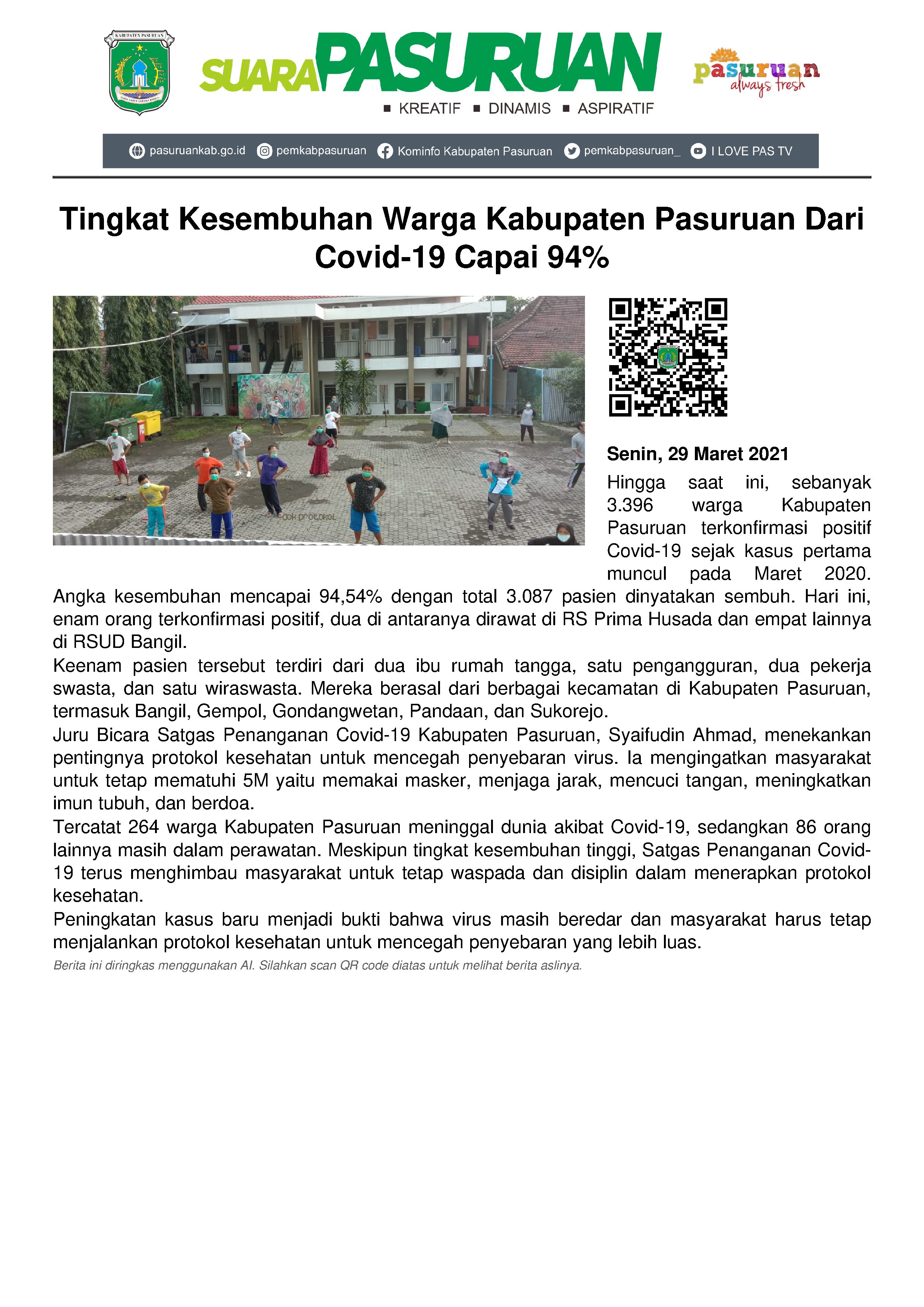 Hingga hari ini, jumlah warga Kabupaten Pasuruan yang telah terpapar Virus Corona sebanyak 3396 orang. Sedangkan angka kesembuhan mencapai 94,54%.
