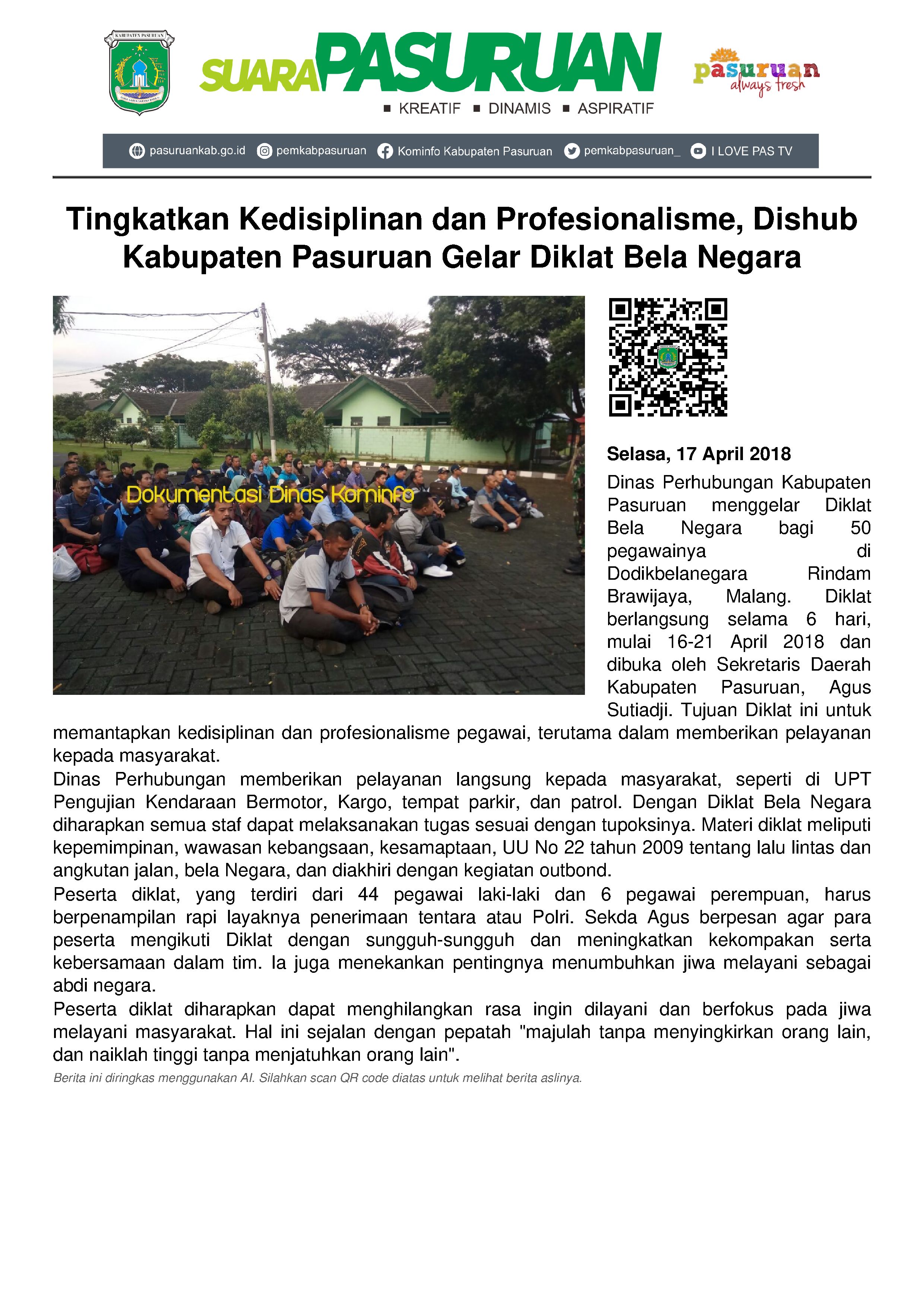 Diklat tersebut dilaksanakan selama 6 hari berturut-turut, yakni mulai 16-21 April 2018 yang langsung dibuka oleh Sekretaris Daerah Kabupaten Pasuruan, Agus Sutiadji.