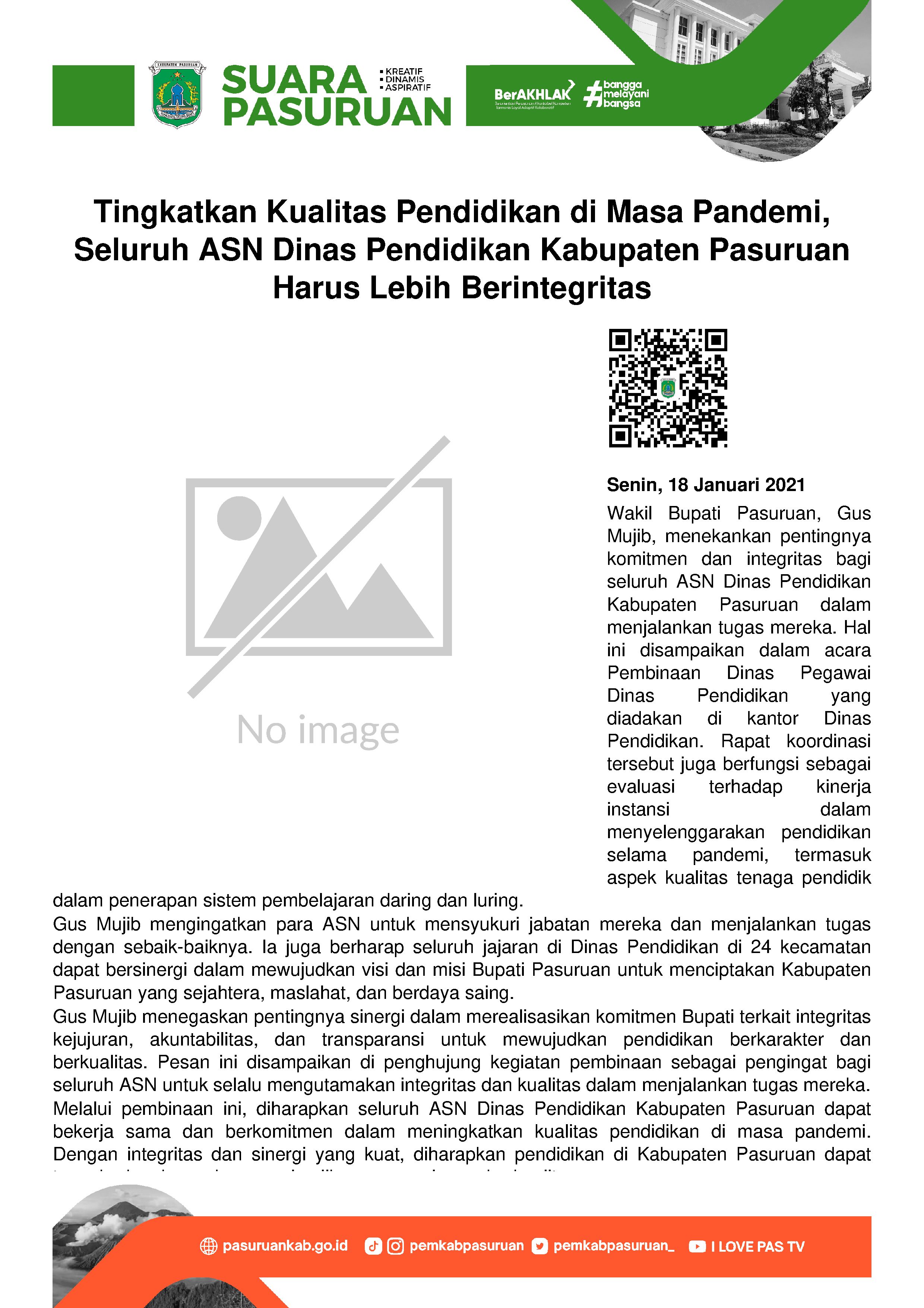Seluruh seluruh Aparatur Sipil Negara (ASN) Dinas Pendidikan Kabupaten Pasuruan harus memiliki komitmen dan integritas kuat dalam melaksanakan tugasnya. Demikian pesan Wakil Bupati Pasuruan, Gus Mujib, sapaan akrab Mujib Imron kepada seluruh peserta Pembinaan Dinas Pegawai Dinas Pendidikan.